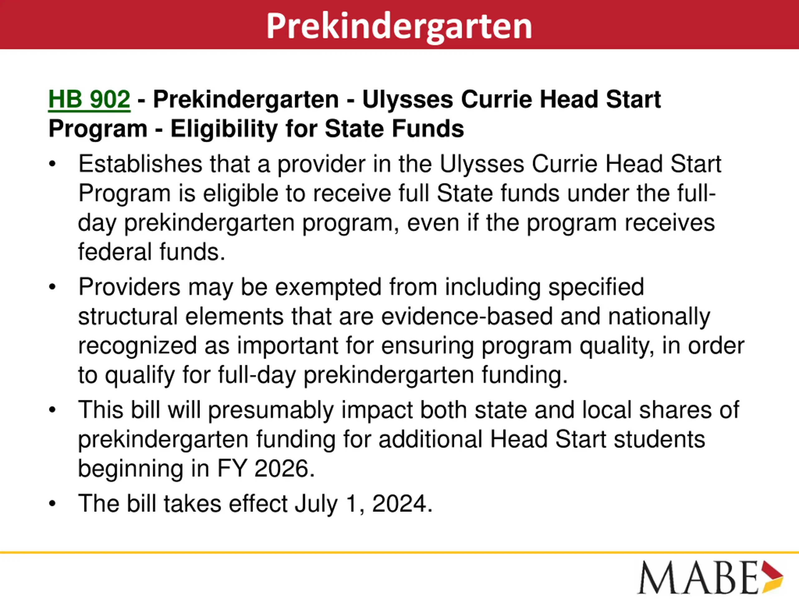 Prekindergarten HB 902 - Prekindergarten - Ulysses Currie Head Start Program - Eligibility for State Funds Establishes that a provider in the Ulysses Currie Head Start Program is eligible to receive full State funds under the full- day prekindergarten program, even if the program receives federal funds. Providers may be exempted from including specified structural elements that are evidence-based and nationally recognized as important for ensuring program quality, in order to qualify for full-day prekindergarten funding. This bill will presumably impact both state and local shares of prekindergarten funding for additional Head Start students beginning in FY 2026. The bill takes effect July 1, 2024.