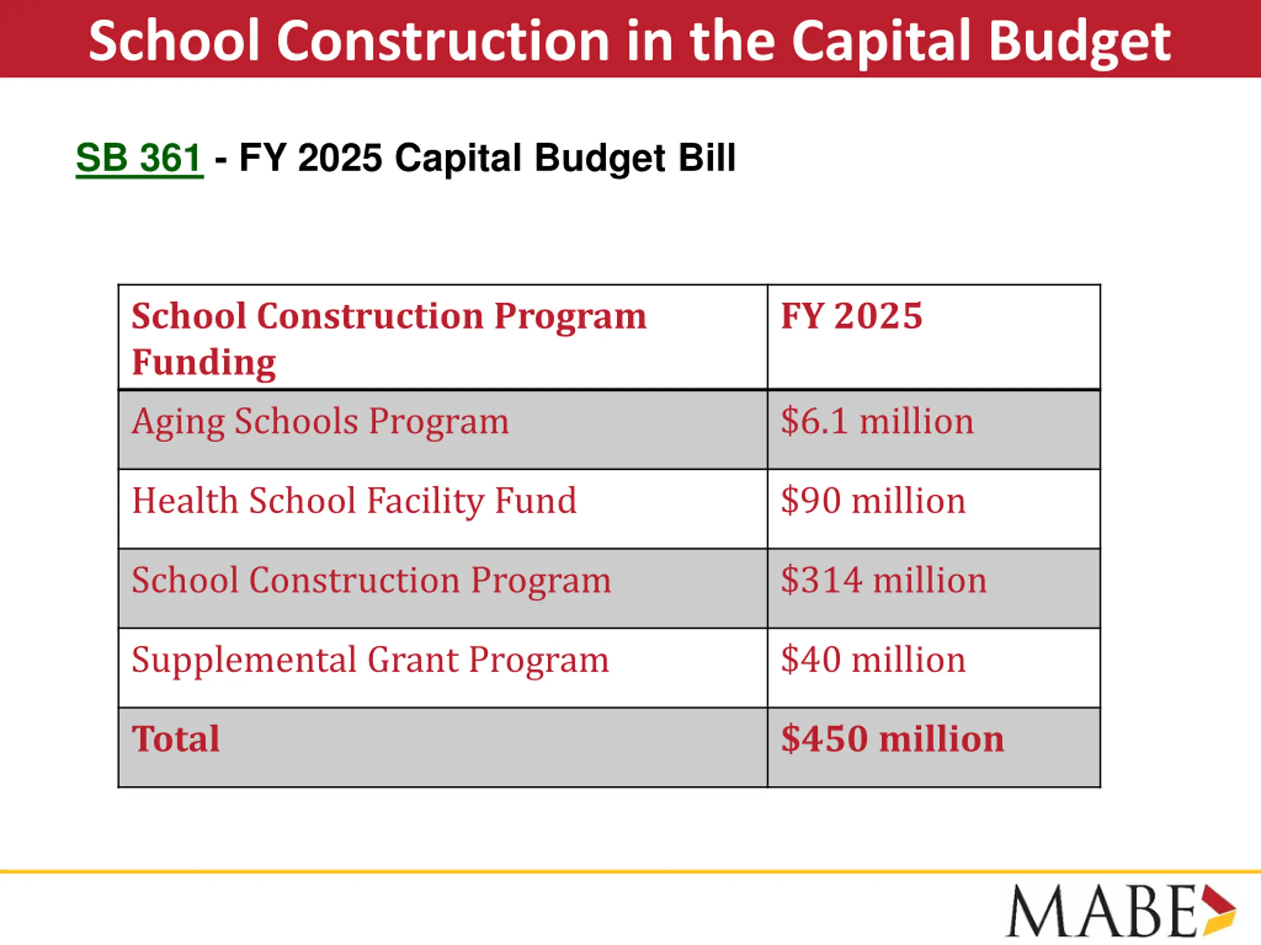 School Construction in the Capital Budget SB 361 - FY 2025 Capital Budget Bill School Construction Program Funding Aging Schools Program FY 2025 $6.1 million Health School Facility Fund $90 million School Construction Program $314 million Supplemental Grant Program $40 million Total $450 million