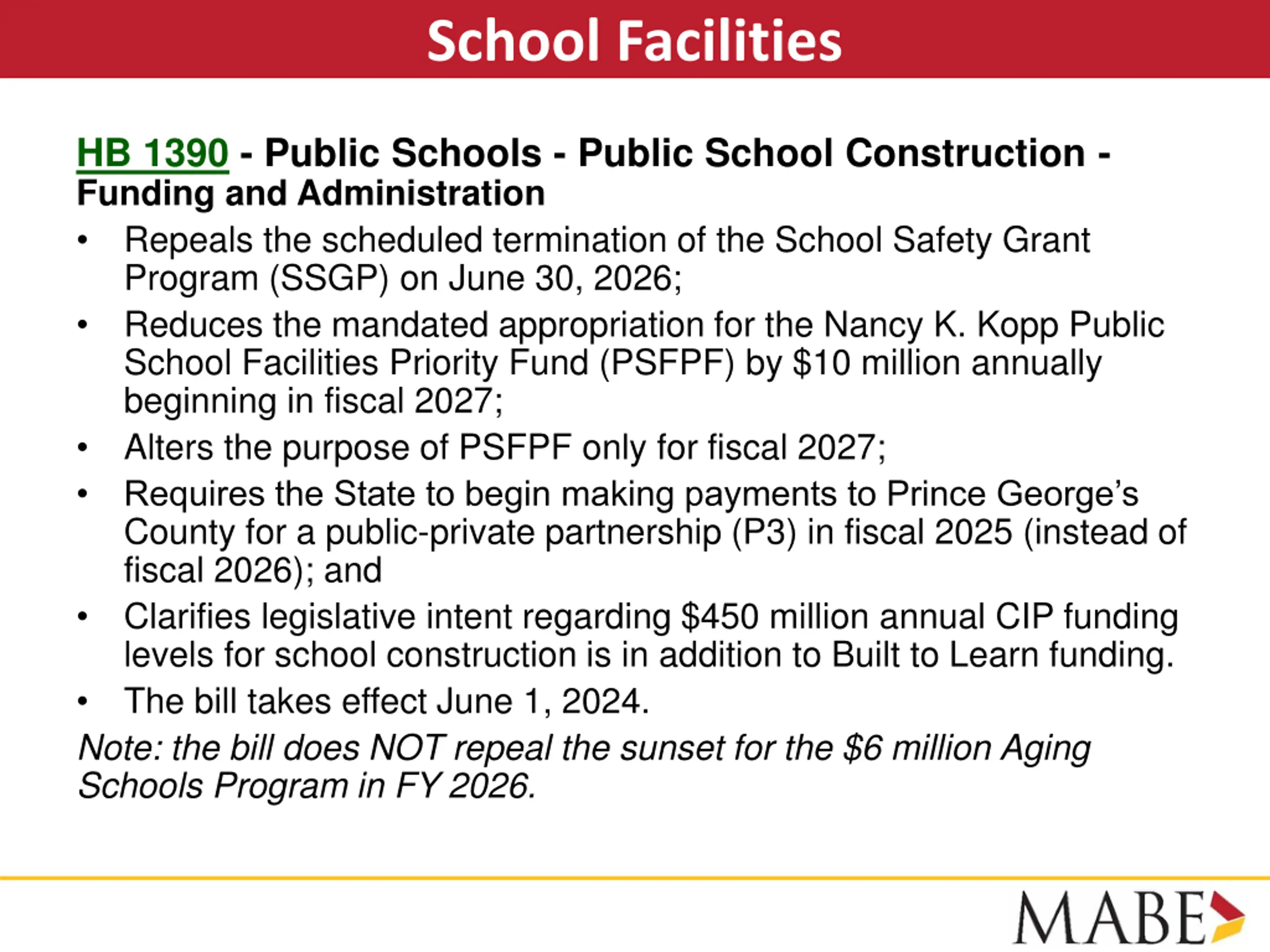 School Facilities HB 1390 - Public Schools - Public School Construction - Funding and Administration Repeals the scheduled termination of the School Safety Grant Program (SSGP) on June 30, 2026; Reduces the mandated appropriation for the Nancy K. Kopp Public School Facilities Priority Fund (PSFPF) by $10 million annually beginning in fiscal 2027; Alters the purpose of PSFPF only for fiscal 2027; Requires the State to begin making payments to Prince George s County for a public-private partnership (P3) in fiscal 2025 (instead of fiscal 2026); and Clarifies legislative intent regarding $450 million annual CIP funding levels for school construction is in addition to Built to Learn funding. The bill takes effect June 1, 2024. Note: the bill does NOT repeal the sunset for the $6 million Aging Schools Program in FY 2026.