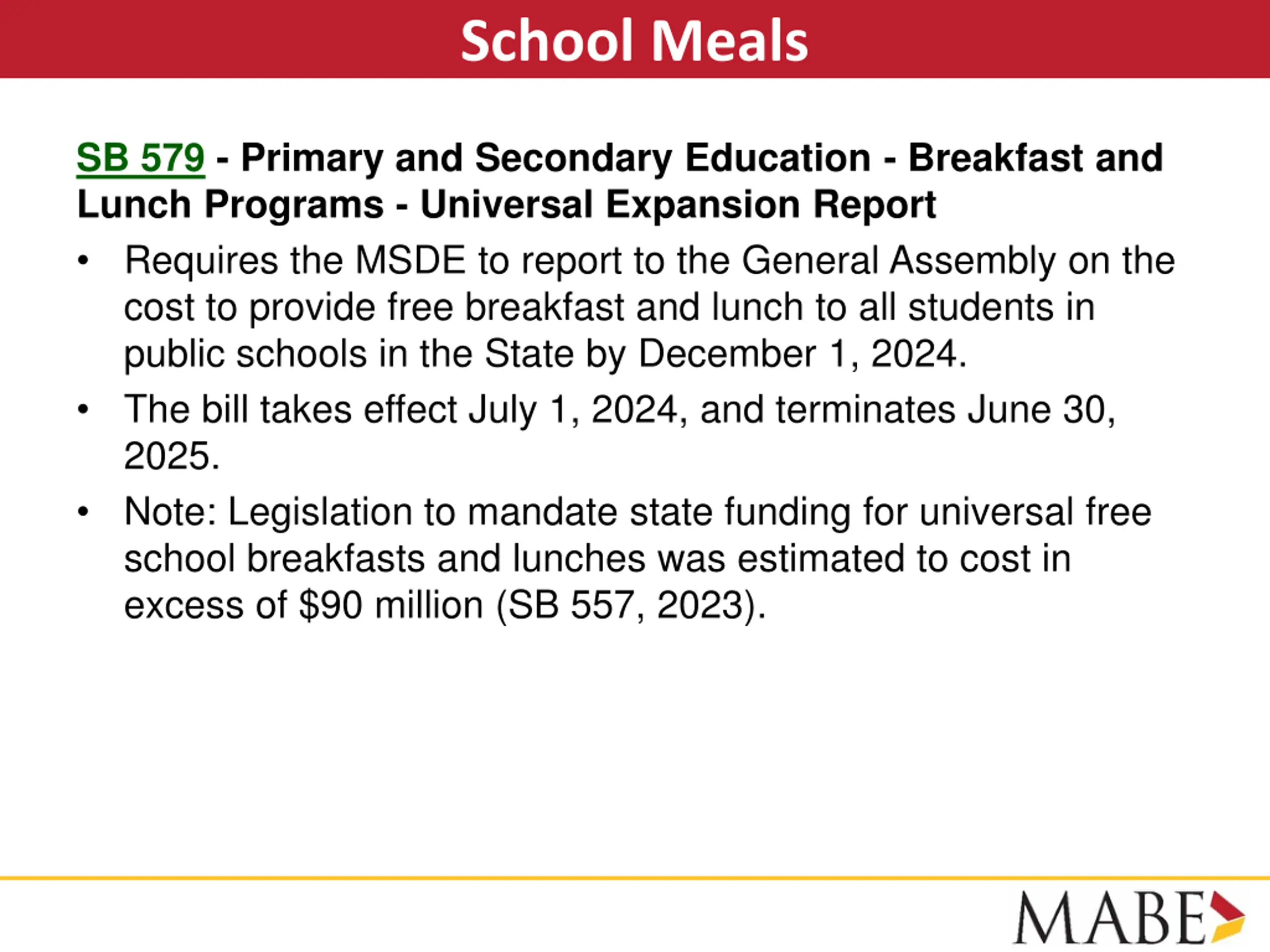 School Meals SB 579 - Primary and Secondary Education - Breakfast and Lunch Programs - Universal Expansion Report Requires the MSDE to report to the General Assembly on the cost to provide free breakfast and lunch to all students in public schools in the State by December 1, 2024. The bill takes effect July 1, 2024, and terminates June 30, 2025. Note: Legislation to mandate state funding for universal free school breakfasts and lunches was estimated to cost in excess of $90 million (SB 557, 2023).