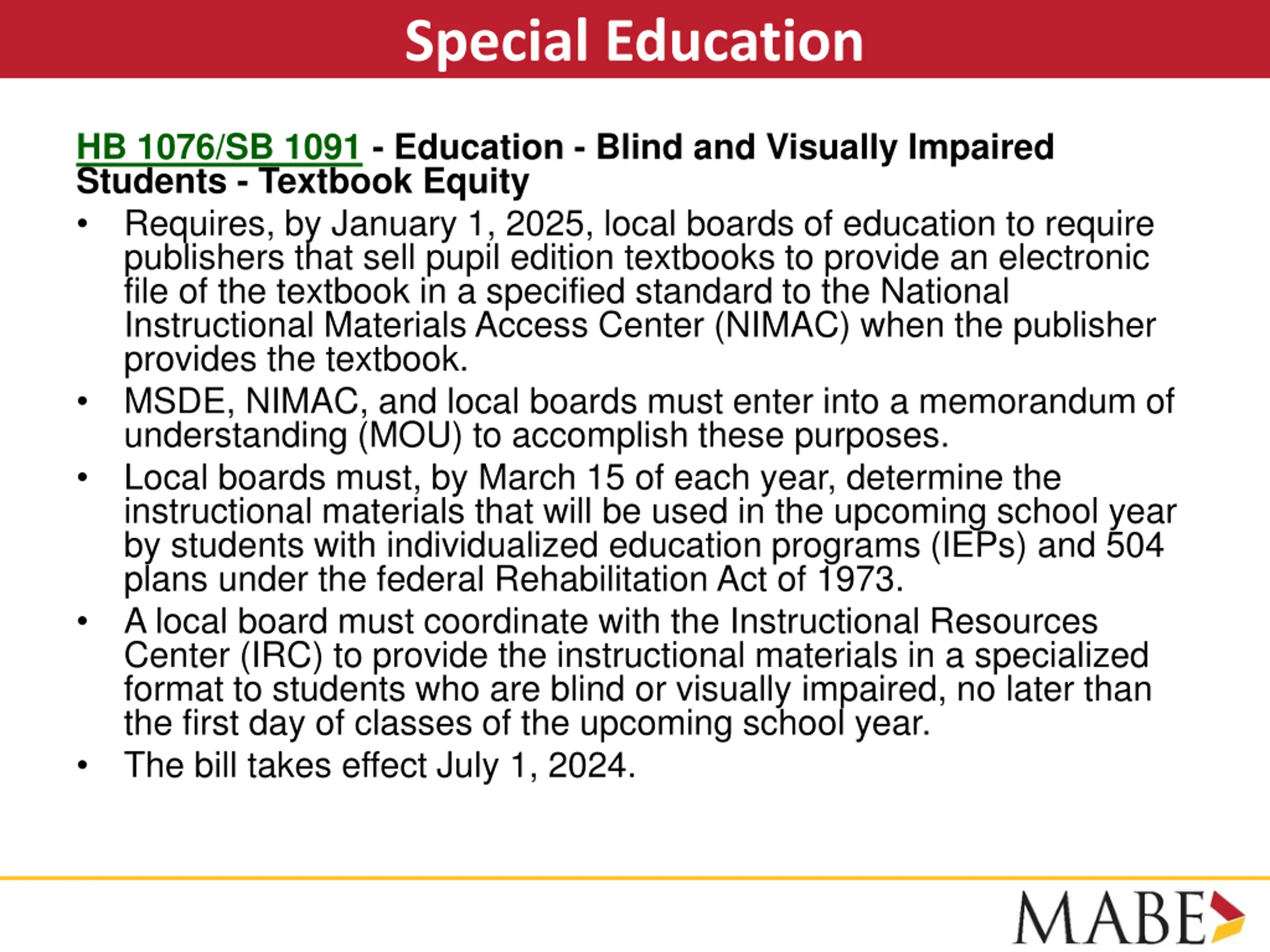 Special Education HB 1076/SB 1091 - Education - Blind and Visually Impaired Students - Textbook Equity Requires, by January 1, 2025, local boards of education to require publishers that sell pupil edition textbooks to provide an electronic file of the textbook in a specified standard to the National Instructional Materials Access Center (NIMAC) when the publisher provides the textbook. MSDE, NIMAC, and local boards must enter into a memorandum of understanding (MOU) to accomplish these purposes. Local boards must, by March 15 of each year, determine the instructional materials that will be used in the upcoming school year by students with individualized education programs (IEPs) and 504 plans under the federal Rehabilitation Act of 1973. A local board must coordinate with the Instructional Resources Center (IRC) to provide the instructional materials in a specialized format to students who are blind or visually impaired, no later than the first day of classes of the upcoming school year. The bill takes effect July 1, 2024.