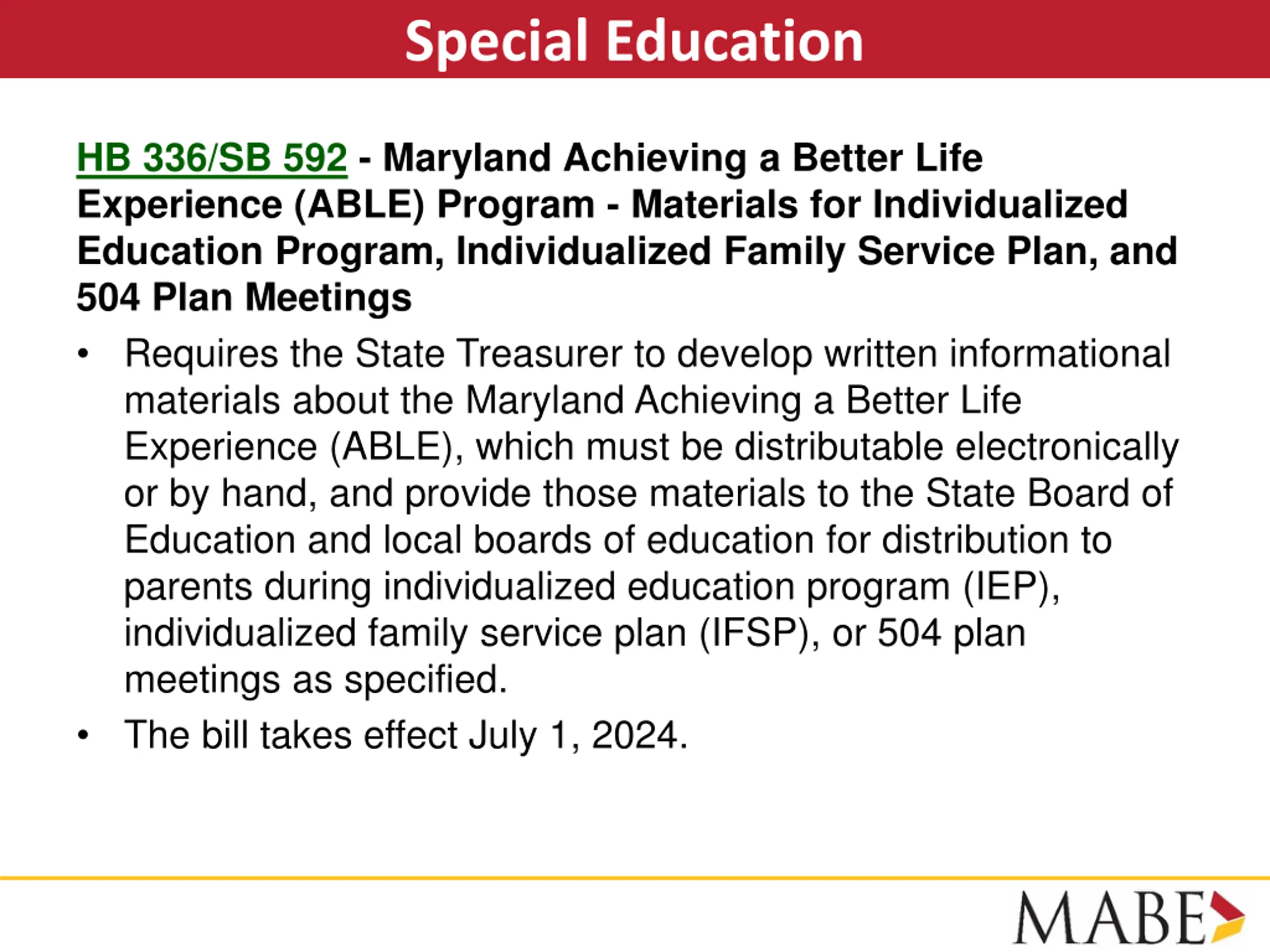 Special Education HB 336/SB 592 - Maryland Achieving a Better Life Experience (ABLE) Program - Materials for Individualized Education Program, Individualized Family Service Plan, and 504 Plan Meetings Requires the State Treasurer to develop written informational materials about the Maryland Achieving a Better Life Experience (ABLE), which must be distributable electronically or by hand, and provide those materials to the State Board of Education and local boards of education for distribution to parents during individualized education program (IEP), individualized family service plan (IFSP), or 504 plan meetings as specified. The bill takes effect July 1, 2024.