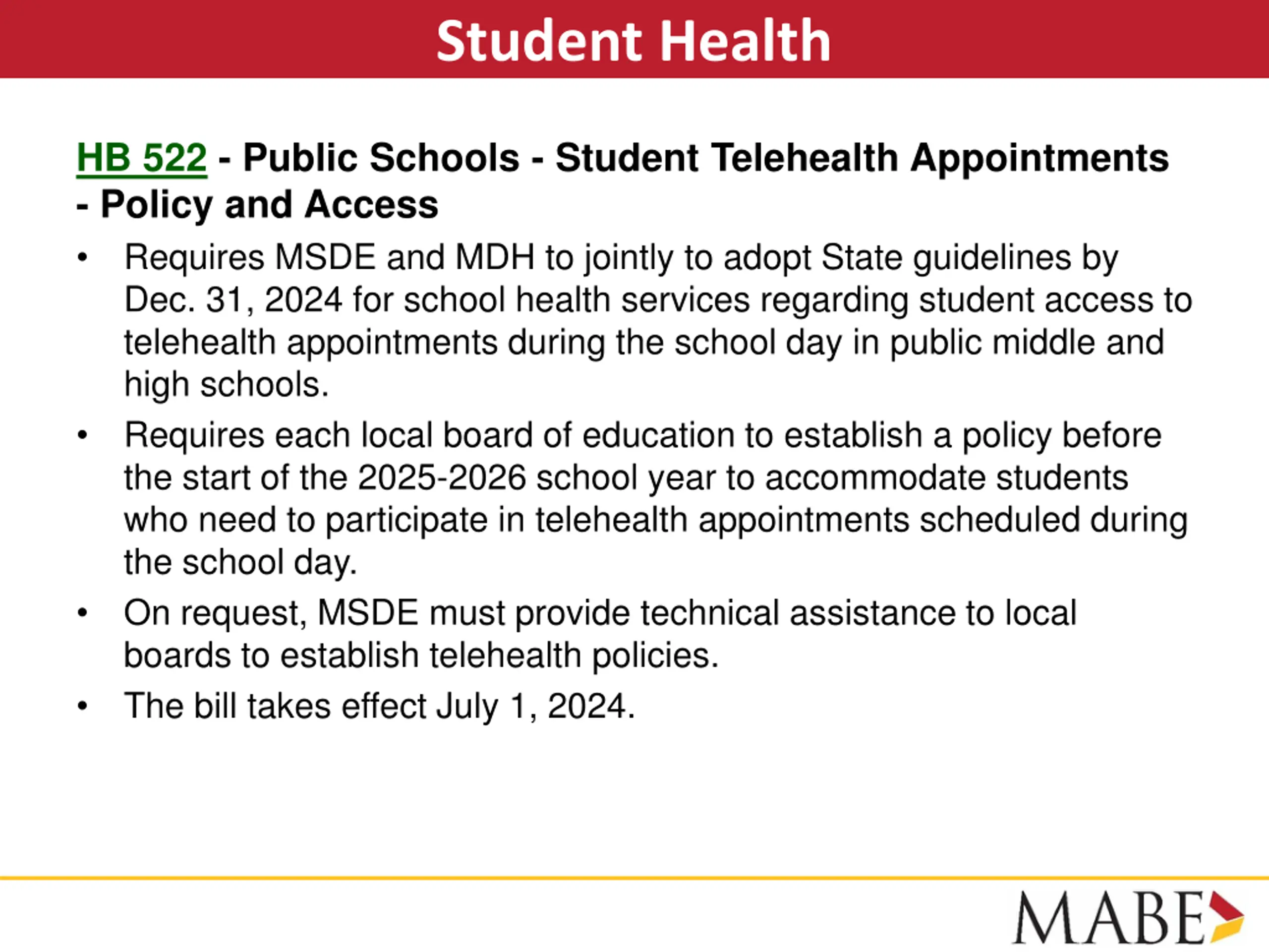 Student Health HB 522 - Public Schools - Student Telehealth Appointments - Policy and Access Requires MSDE and MDH to jointly to adopt State guidelines by Dec. 31, 2024 for school health services regarding student access to telehealth appointments during the school day in public middle and high schools. Requires each local board of education to establish a policy before the start of the 2025-2026 school year to accommodate students who need to participate in telehealth appointments scheduled during the school day. On request, MSDE must provide technical assistance to local boards to establish telehealth policies. The bill takes effect July 1, 2024.