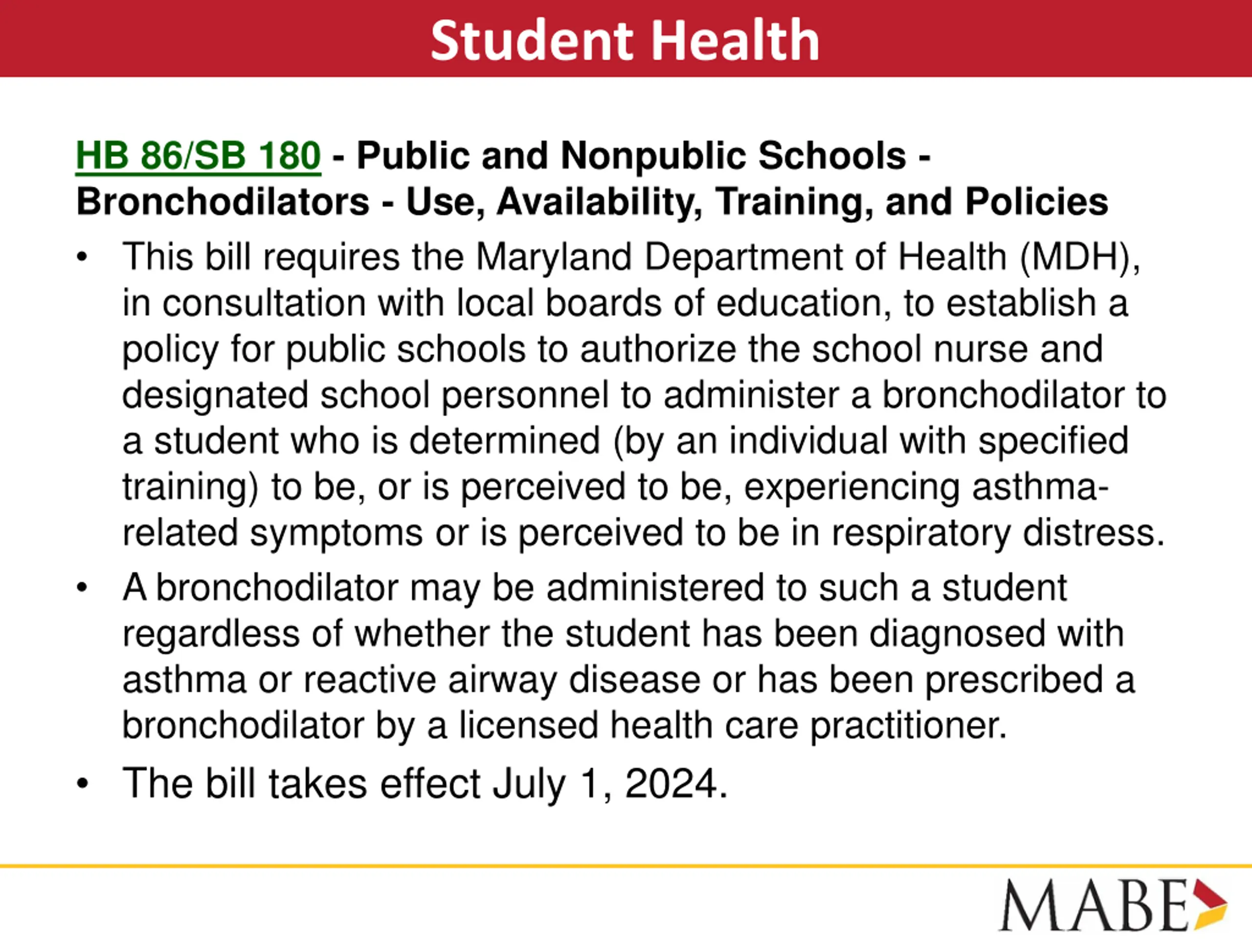 Student Health HB 86/SB 180 - Public and Nonpublic Schools - Bronchodilators - Use, Availability, Training, and Policies This bill requires the Maryland Department of Health (MDH), in consultation with local boards of education, to establish a policy for public schools to authorize the school nurse and designated school personnel to administer a bronchodilator to a student who is determined (by an individual with specified training) to be, or is perceived to be, experiencing asthma- related symptoms or is perceived to be in respiratory distress. A bronchodilator may be administered to such a student regardless of whether the student has been diagnosed with asthma or reactive airway disease or has been prescribed a bronchodilator by a licensed health care practitioner. The bill takes effect July 1, 2024.