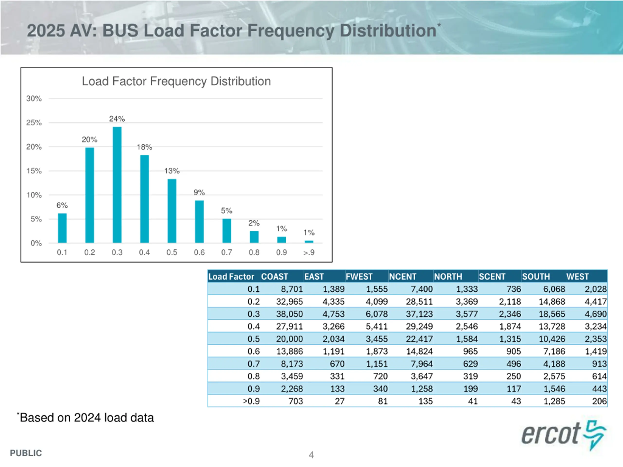 2025 AV: BUS Load Factor Frequency Distribution* Load Factor Frequency Distribution 30% 24% 25% 20% 20% 18% 15% 13% 9% 10% 6% 5% 5% 2% 1% 1% 0% 0.1 0.2 0.3 0.4 0.5 0.6 0.7 0.8 0.9 >.9 Load Factor COAST 0.1 0.2 0.3 0.4 0.5 0.6 0.7 0.8 0.9 >0.9 EAST FWEST NCENT NORTH SCENT SOUTH WEST 8,701 32,965 38,050 27,911 20,000 13,886 8,173 3,459 2,268 703 1,389 4,335 4,753 3,266 2,034 1,191 670 331 133 1,555 4,099 6,078 5,411 3,455 1,873 1,151 720 340 7,400 28,511 37,123 29,249 22,417 14,824 7,964 3,647 1,258 135 1,333 3,369 3,577 2,546 1,584 965 629 319 199 736 6,068 14,868 18,565 13,728 10,426 7,186 4,188 2,575 1,546 1,285 2,028 4,417 4,690 3,234 2,353 1,419 913 614 443 206 2,118 2,346 1,874 1,315 905 496 250 117 27 81 41 43 *Based on 2024 load data PUBLIC 4