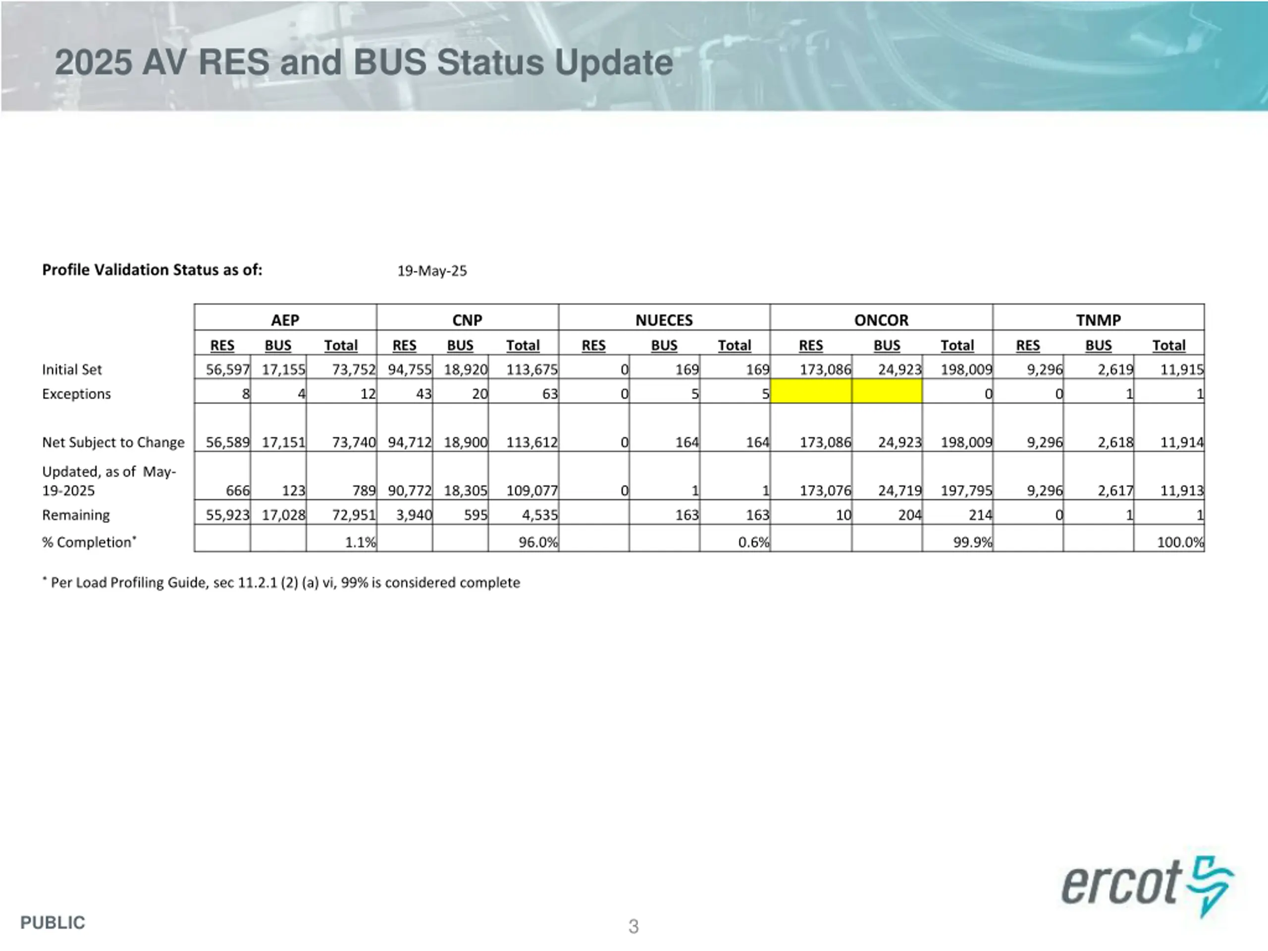 2025 AV RES and BUS Status Update Profile Validation Status as of: 19-May-25 AEP CNP NUECES ONCOR TNMP RES BUS Total RES BUS Total RES BUS Total RES BUS Total RES BUS Total Initial Set 56,597 17,155 73,752 94,755 18,920 113,675 0 169 169 173,086 24,923 198,009 9,296 2,619 11,915 Exceptions 8 4 12 43 20 63 0 5 5 0 0 1 1 Net Subject to Change 56,589 17,151 73,740 94,712 18,900 113,612 0 164 164 173,086 24,923 198,009 9,296 2,618 11,914 Updated, as of May- 19-2025 666 123 789 90,772 18,305 109,077 0 1 1 173,076 24,719 197,795 9,296 2,617 11,913 Remaining 55,923 17,028 72,951 3,940 595 4,535 163 163 10 204 214 0 1 1 % Completion* 1.1% 96.0% 0.6% 99.9% 100.0% * Per Load Profiling Guide, sec 11.2.1 (2) (a) vi, 99% is considered complete PUBLIC 3