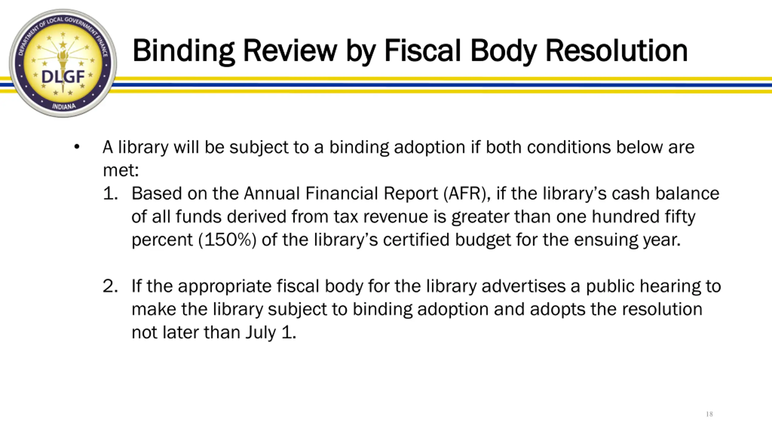 Binding Review by Fiscal Body Resolution Binding Review by Fiscal Body Resolution A library will be subject to a binding adoption if both conditions below are met: 1. Based on the Annual Financial Report (AFR), if the library s cash balance of all funds derived from tax revenue is greater than one hundred fifty percent (150%) of the library s certified budget for the ensuing year. 2. If the appropriate fiscal body for the library advertises a public hearing to make the library subject to binding adoption and adopts the resolution not later than July 1. 18