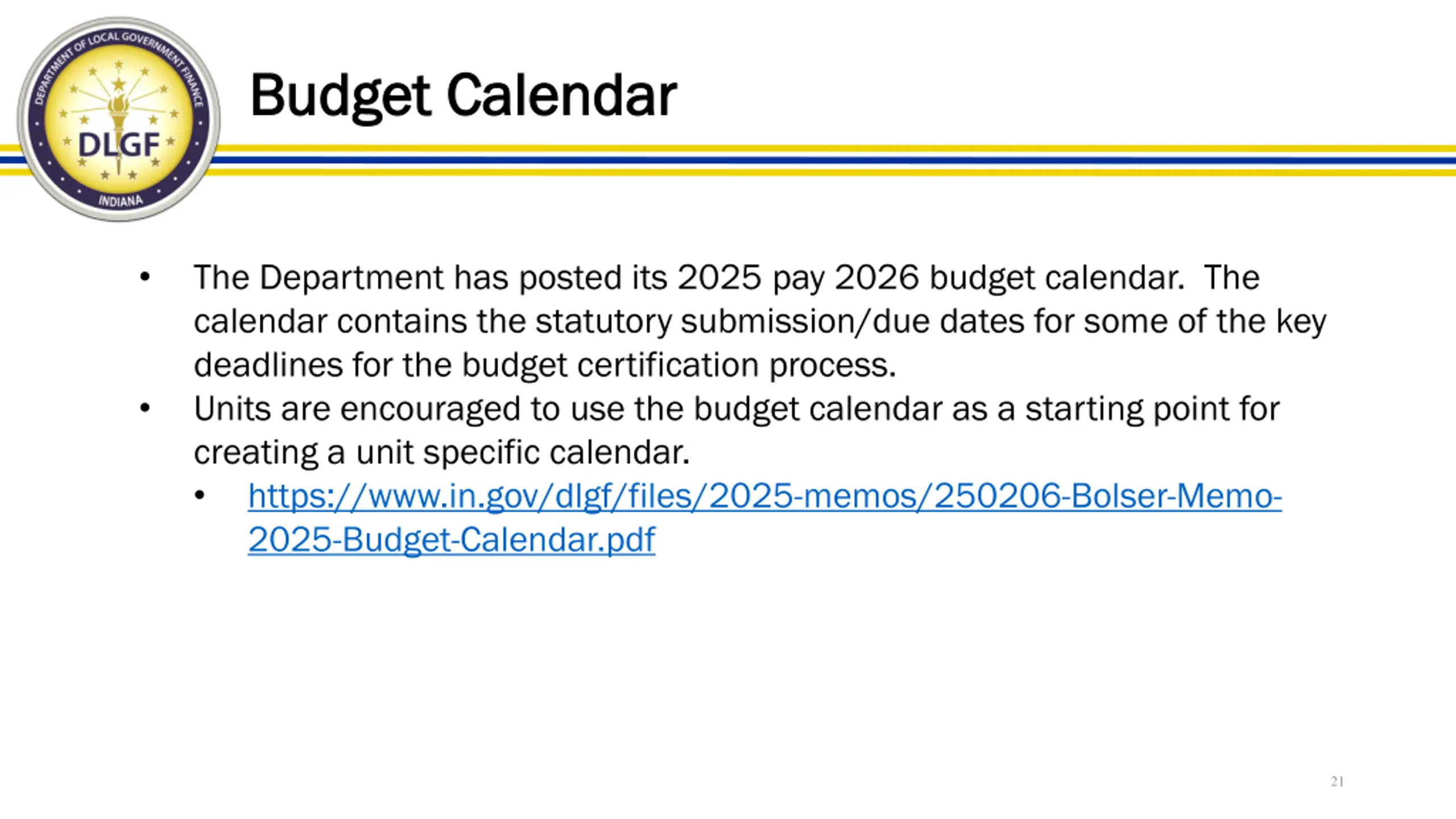 Budget Calendar Budget Calendar The Department has posted its 2025 pay 2026 budget calendar. The calendar contains the statutory submission/due dates for some of the key deadlines for the budget certification process. Units are encouraged to use the budget calendar as a starting point for creating a unit specific calendar. https://www.in.gov/dlgf/files/2025-memos/250206-Bolser-Memo- 2025-Budget-Calendar.pdf 21