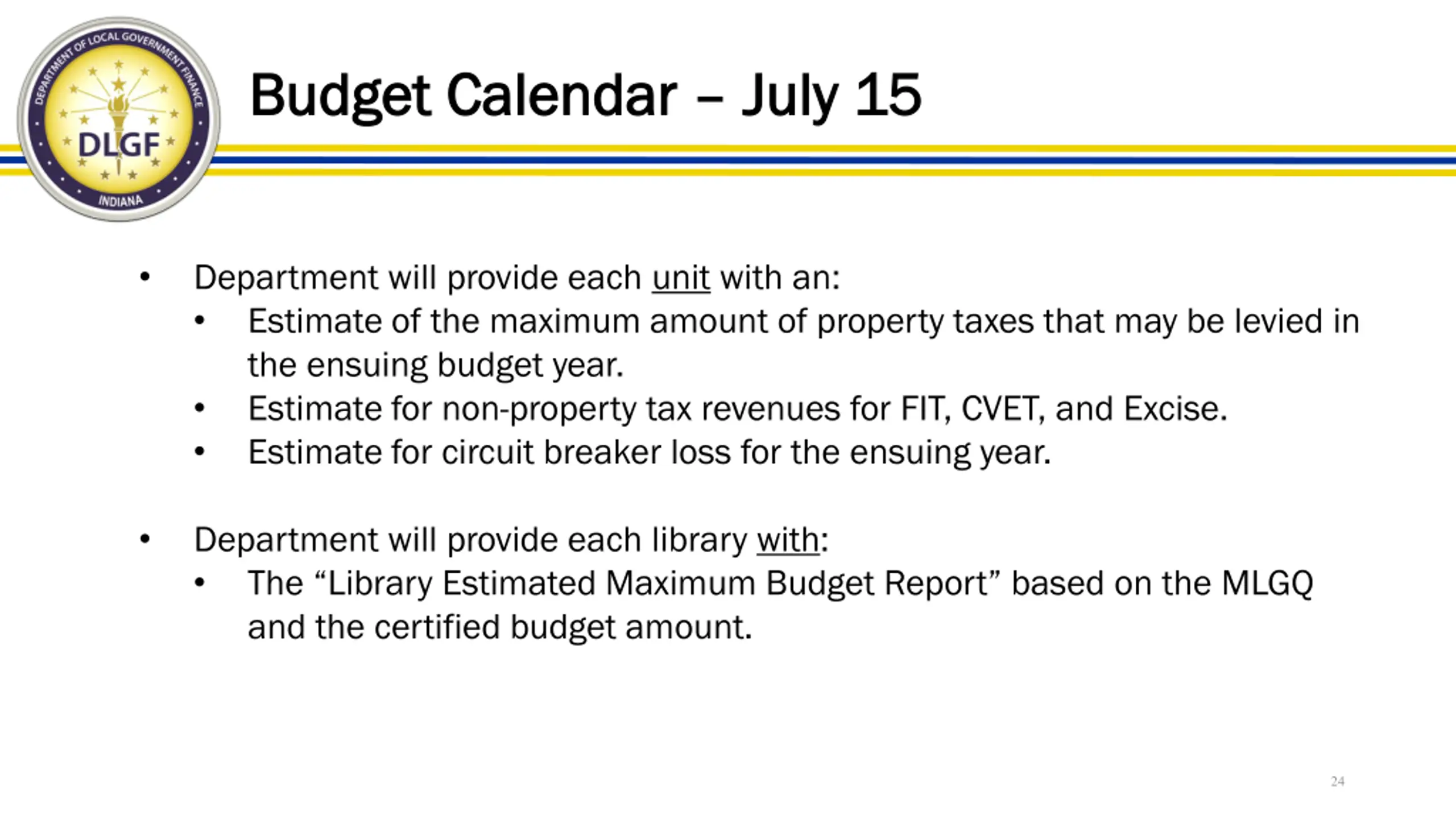 Budget Calendar Budget Calendar July 15 July 15 Department will provide each unit with an: Estimate of the maximum amount of property taxes that may be levied in the ensuing budget year. Estimate for non-property tax revenues for FIT, CVET, and Excise. Estimate for circuit breaker loss for the ensuing year. Department will provide each library with: The Library Estimated Maximum Budget Report based on the MLGQ and the certified budget amount. 24