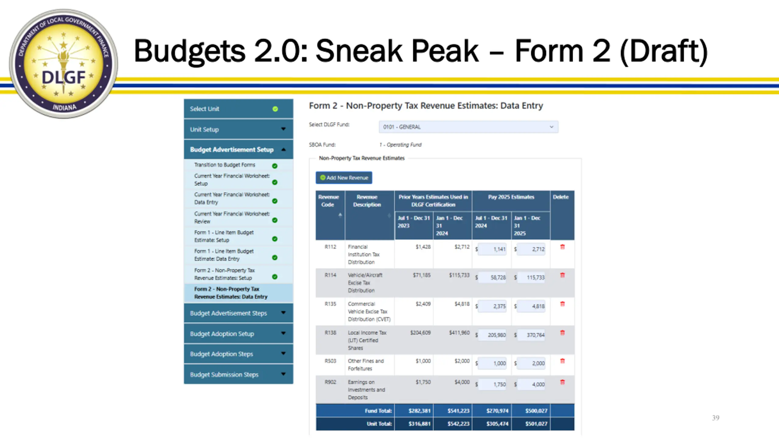 Budgets 2.0 is Coming Soon Budgets 2.0 is Coming Soon This streamlined budget application is currently scheduled to launch in 2026 pay 2027. Below are some of the notable planned features (subject to change) The budgeting steps presented in a clear linear process. It will ask a few questions before certain forms to tailor the data collection process to only those that apply to you. Side by side comparisons of the previous year s amounts will be available in the Form 1: Line-Item Budget Estimates and Form 2: Non-Property Tax Revenue Estimates. Incorporation of Department estimates available if desired. 36