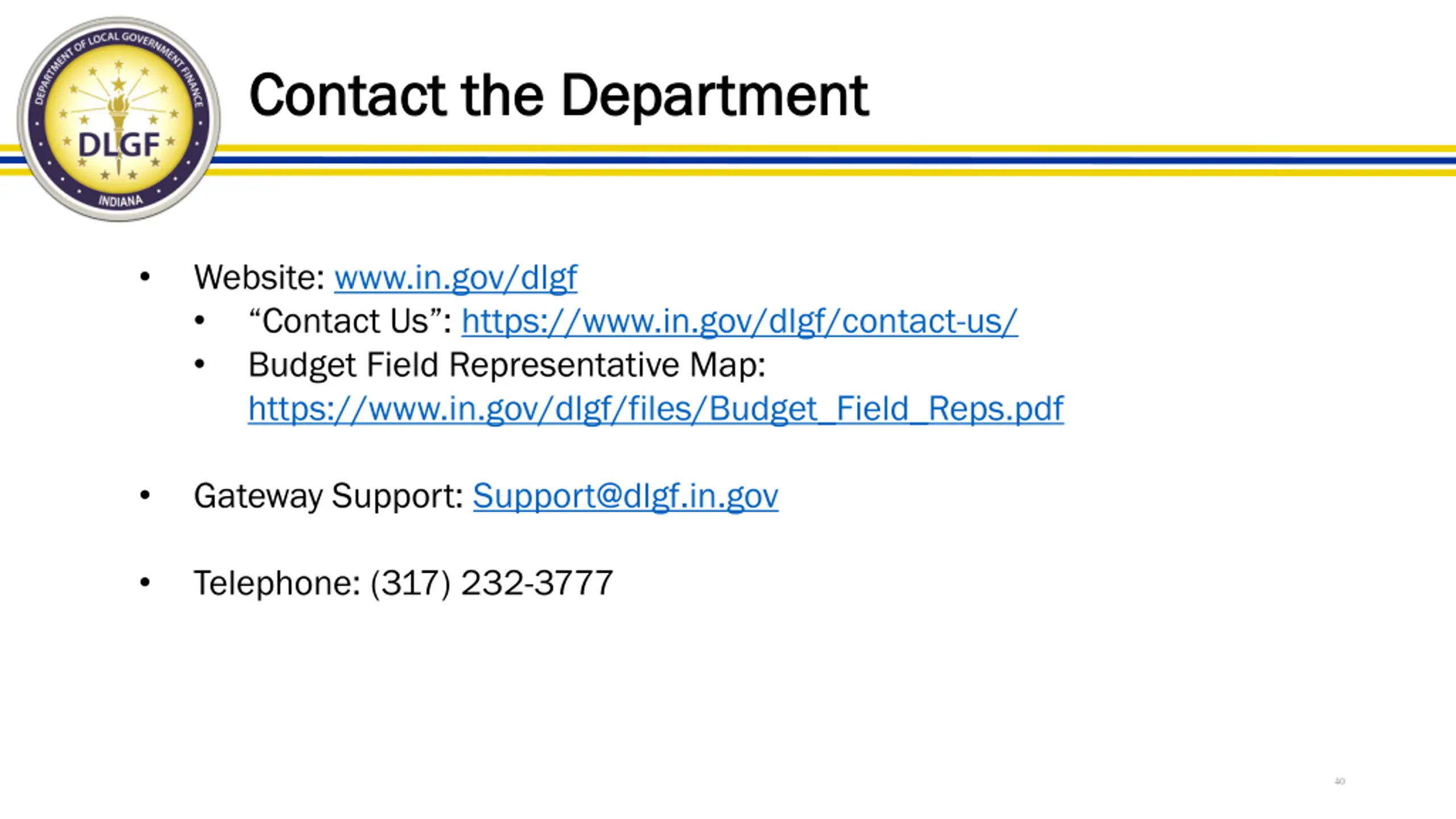 Contact the Department Contact the Department Website: www.in.gov/dlgf Contact Us : https://www.in.gov/dlgf/contact-us/ Budget Field Representative Map: https://www.in.gov/dlgf/files/Budget_Field_Reps.pdf Gateway Support: Support@dlgf.in.gov Telephone: (317) 232-3777 40