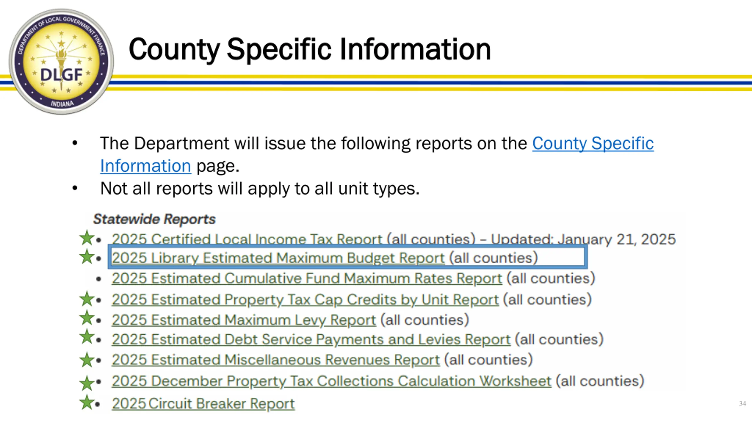 County Specific Information County Specific Information In addition to the written guidance, the Department posts various calculations summarized by county. This includes budget orders, maximum levies, estimated circuit breaker report, and the Library Maximum Budget Report. 33
