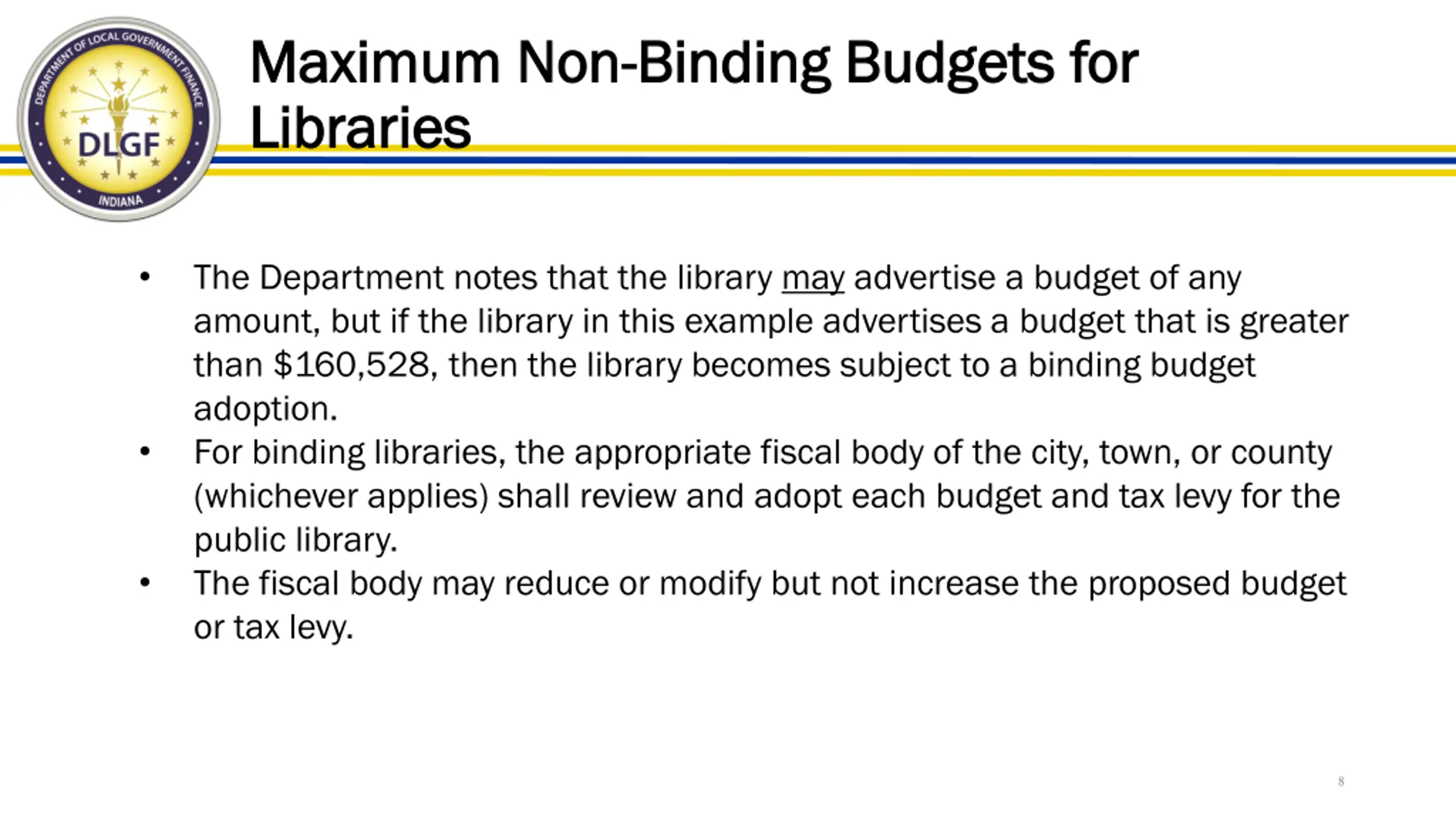 Maximum Non Maximum Non- -Binding Budgets for Binding Budgets for Libraries Libraries Pursuant to Ind. Code 6-1.1-17-20.3, library boards may adopt budgets and levies for libraries that grow their budget by no more than the prior year budget multiplied by the MLGQ minus $1 (rounded down). In the example below: for the ensuing year, the library board will have the authority to adopt any budget less than or equal to $160,528. Any budget advertised for $160,529 or more, must be adopted by the appropriate county, city, or town fiscal body. 7