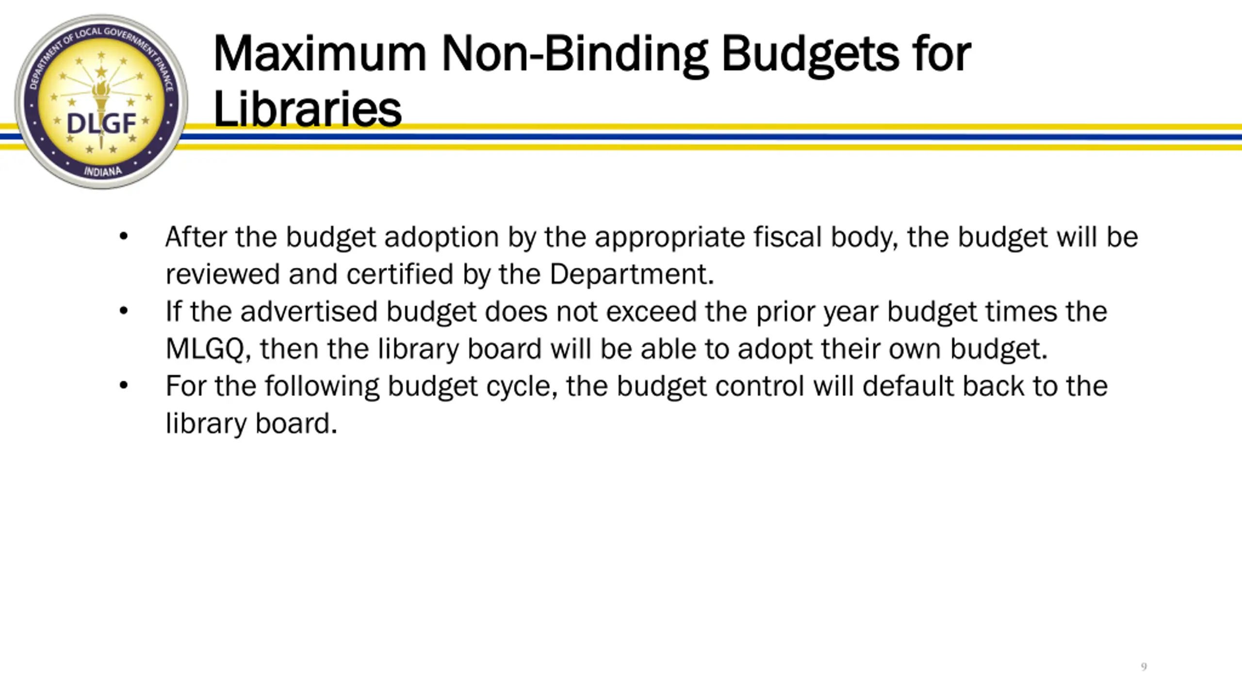 Maximum Non Maximum Non- -Binding Budgets for Binding Budgets for Libraries Libraries The Department notes that the library may advertise a budget of any amount, but if the library in this example advertises a budget that is greater than $160,528, then the library becomes subject to a binding budget adoption. For binding libraries, the appropriate fiscal body of the city, town, or county (whichever applies) shall review and adopt each budget and tax levy for the public library. The fiscal body may reduce or modify but not increase the proposed budget or tax levy. 8