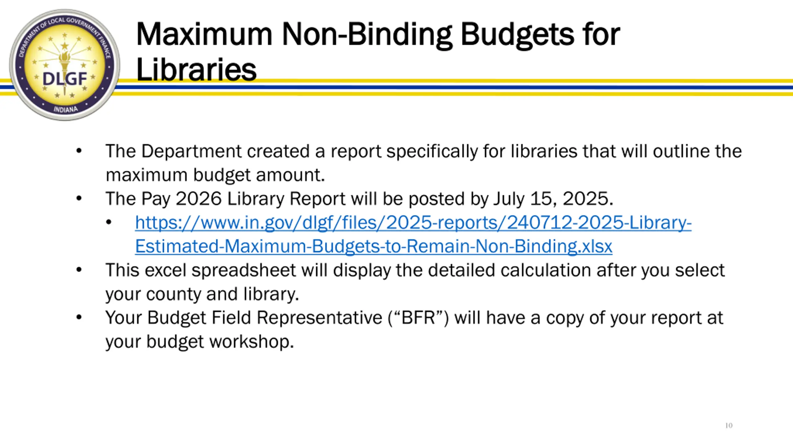 Maximum Non Maximum Non- -Binding Budgets for Binding Budgets for Libraries Libraries The Department created a report specifically for libraries that will outline the maximum budget amount. The Pay 2026 Library Report will be posted by July 15, 2025. https://www.in.gov/dlgf/files/2025-reports/240712-2025-Library- Estimated-Maximum-Budgets-to-Remain-Non-Binding.xlsx This excel spreadsheet will display the detailed calculation after you select your county and library. Your Budget Field Representative ( BFR ) will have a copy of your report at your budget workshop. 10