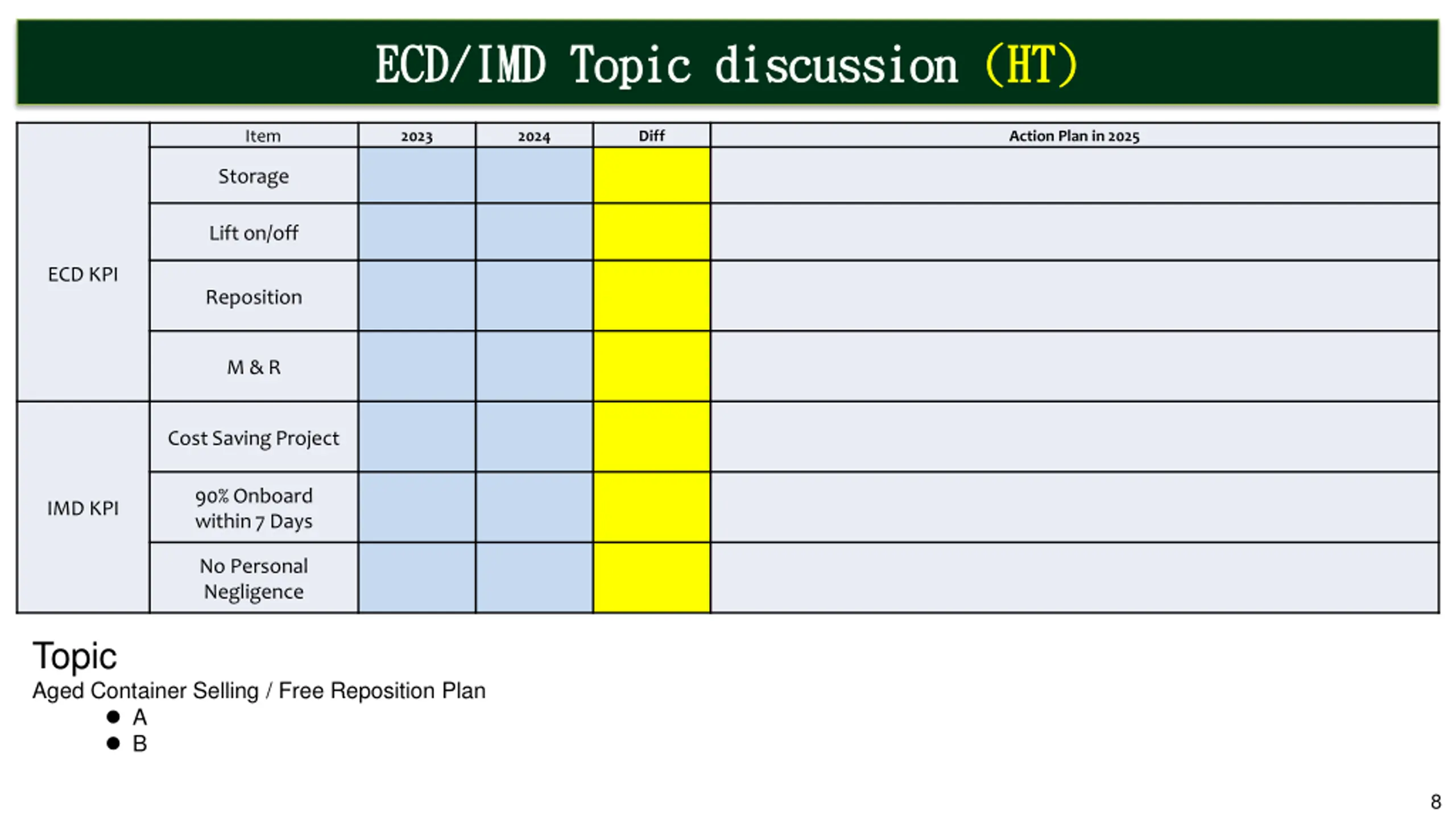 ECD/IMD Topic discussion ECD/IMD Topic discussion (HT) (HT) Item 2023 2024 Diff Action Plan in 2025 Storage Lift on/off ECD KPI Reposition M & R Cost Saving Project 90% Onboard within 7 Days IMD KPI No Personal Negligence Topic Aged Container Selling / Free Reposition Plan A B 8