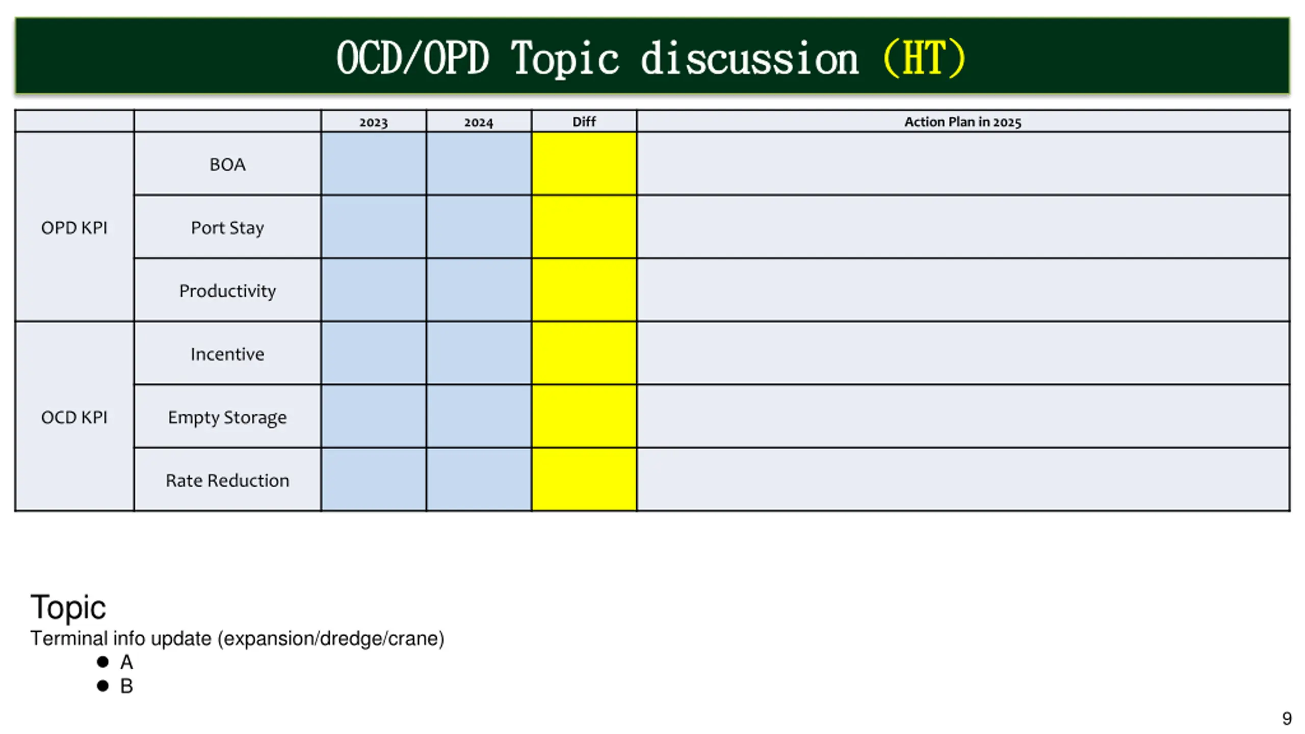OCD/OPD Topic discussion OCD/OPD Topic discussion (HT) (HT) 2023 2024 Diff Action Plan in 2025 BOA OPD KPI Port Stay Productivity Incentive OCD KPI Empty Storage Rate Reduction Topic Terminal info update (expansion/dredge/crane) A B 9