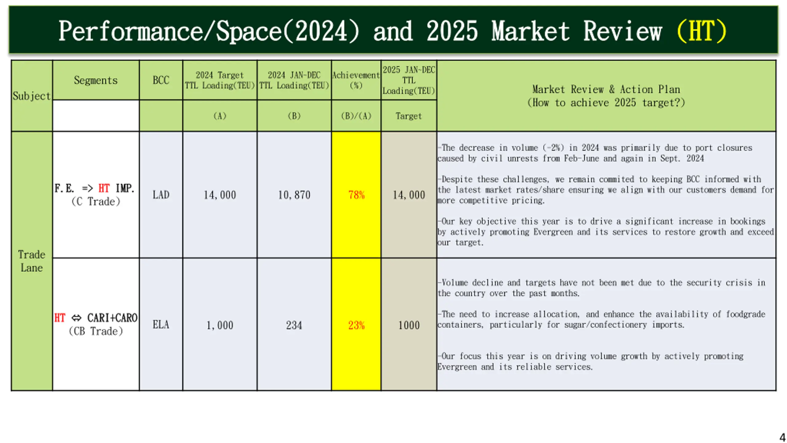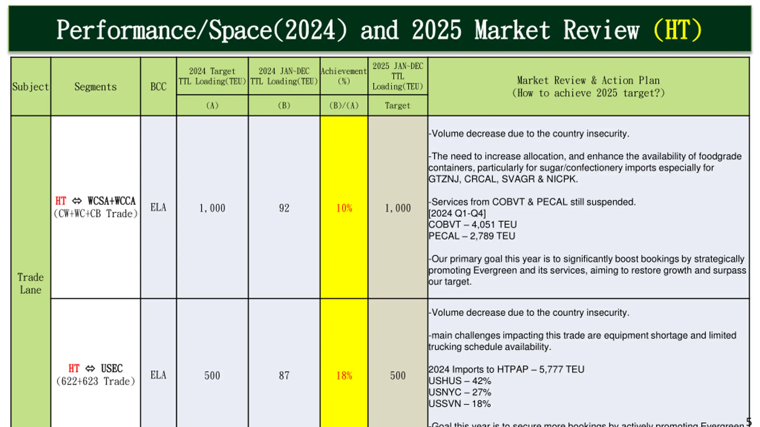 Performance/Space(2024) and 2025 Market Review Performance/Space(2024) and 2025 Market Review (HT) (HT) 2025 JAN~DEC TTL Loading(TEU) 2024 Target TTL Loading(TEU) 2024 JAN~DEC TTL Loading(TEU) Achievement (%) Market Review & Action Plan (How to achieve 2025 target?) Subject Segments BCC (A) (B) (B)/(A) Target -Volume decrease due to the country insecurity. -The need to increase allocation, and enhance the availability of foodgrade containers, particularly for sugar/confectionery imports especially for GTZNJ, CRCAL, SVAGR & NICPK. HT HT (CW+WC+CB Trade) WCSA+WCCA WCSA+WCCA -Services from COBVT & PECAL still suspended. [2024 Q1-Q4] COBVT 4,051 TEU PECAL 2,789 TEU ELA 1,000 92 10% 1,000 -Our primary goal this year is to significantly boost bookings by strategically promoting Evergreen and its services, aiming to restore growth and surpass our target. Trade Lane -Volume decrease due to the country insecurity. -main challenges impacting this trade are equipment shortage and limited trucking schedule availability. HT HT (622+623 Trade) USEC USEC 2024 Imports to HTPAP 5,777 TEU USHUS 42% USNYC 27% USSVN 18% ELA 500 87 18% 500 -Goal this year is to secure more bookings by actively promoting Evergreen 5