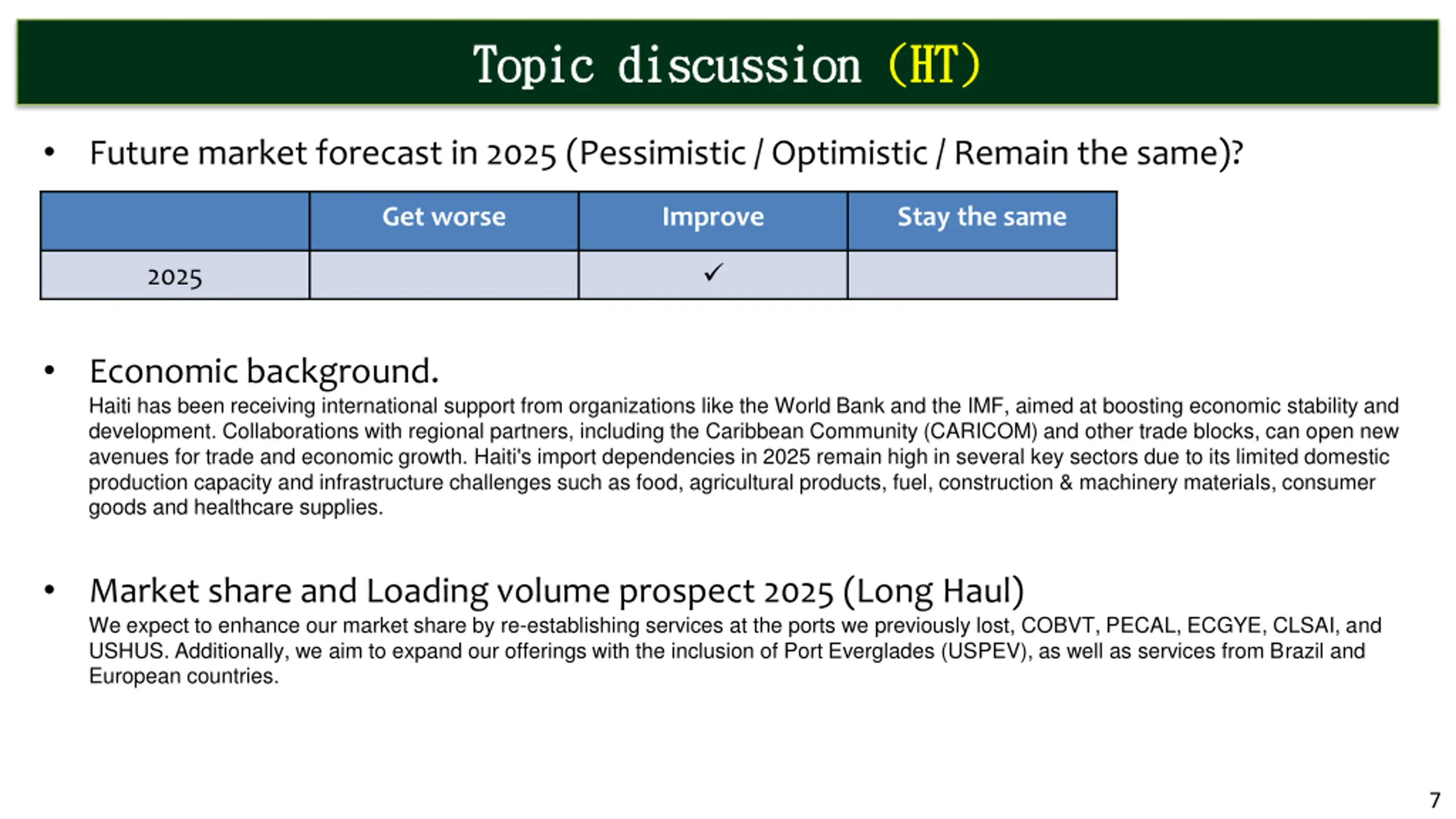 Topic discussion Topic discussion (HT) (HT) Future market forecast in 2025 (Pessimistic / Optimistic / Remain the same)? Get worse Improve Stay the same 2025 Economic background. Haiti has been receiving international support from organizations like the World Bank and the IMF, aimed at boosting economic stability and development. Collaborations with regional partners, including the Caribbean Community (CARICOM) and other trade blocks, can open new avenues for trade and economic growth. Haiti's import dependencies in 2025 remain high in several key sectors due to its limited domestic production capacity and infrastructure challenges such as food, agricultural products, fuel, construction & machinery materials, consumer goods and healthcare supplies. Market share and Loading volume prospect 2025 (Long Haul) We expect to enhance our market share by re-establishing services at the ports we previously lost, COBVT, PECAL, ECGYE, CLSAI, and USHUS. Additionally, we aim to expand our offerings with the inclusion of Port Everglades (USPEV), as well as services from Brazil and European countries. 7