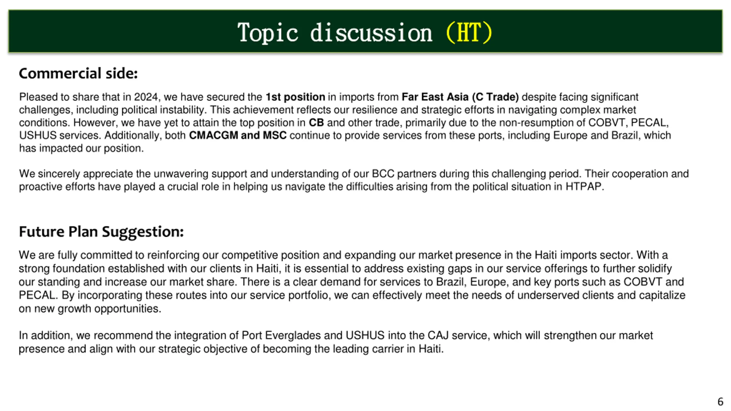 Topic discussion Topic discussion (HT) (HT) Commercial side: Pleased to share that in 2024, we have secured the 1st position in imports from Far East Asia (C Trade) despite facing significant challenges, including political instability. This achievement reflects our resilience and strategic efforts in navigating complex market conditions. However, we have yet to attain the top position in CB and other trade, primarily due to the non-resumption of COBVT, PECAL, USHUS services. Additionally, both CMACGM and MSC continue to provide services from these ports, including Europe and Brazil, which has impacted our position. We sincerely appreciate the unwavering support and understanding of our BCC partners during this challenging period. Their cooperation and proactive efforts have played a crucial role in helping us navigate the difficulties arising from the political situation in HTPAP. Future Plan Suggestion: We are fully committed to reinforcing our competitive position and expanding our market presence in the Haiti imports sector. With a strong foundation established with our clients in Haiti, it is essential to address existing gaps in our service offerings to further solidify our standing and increase our market share. There is a clear demand for services to Brazil, Europe, and key ports such as COBVT and PECAL. By incorporating these routes into our service portfolio, we can effectively meet the needs of underserved clients and capitalize on new growth opportunities. In addition, we recommend the integration of Port Everglades and USHUS into the CAJ service, which will strengthen our market presence and align with our strategic objective of becoming the leading carrier in Haiti. 6