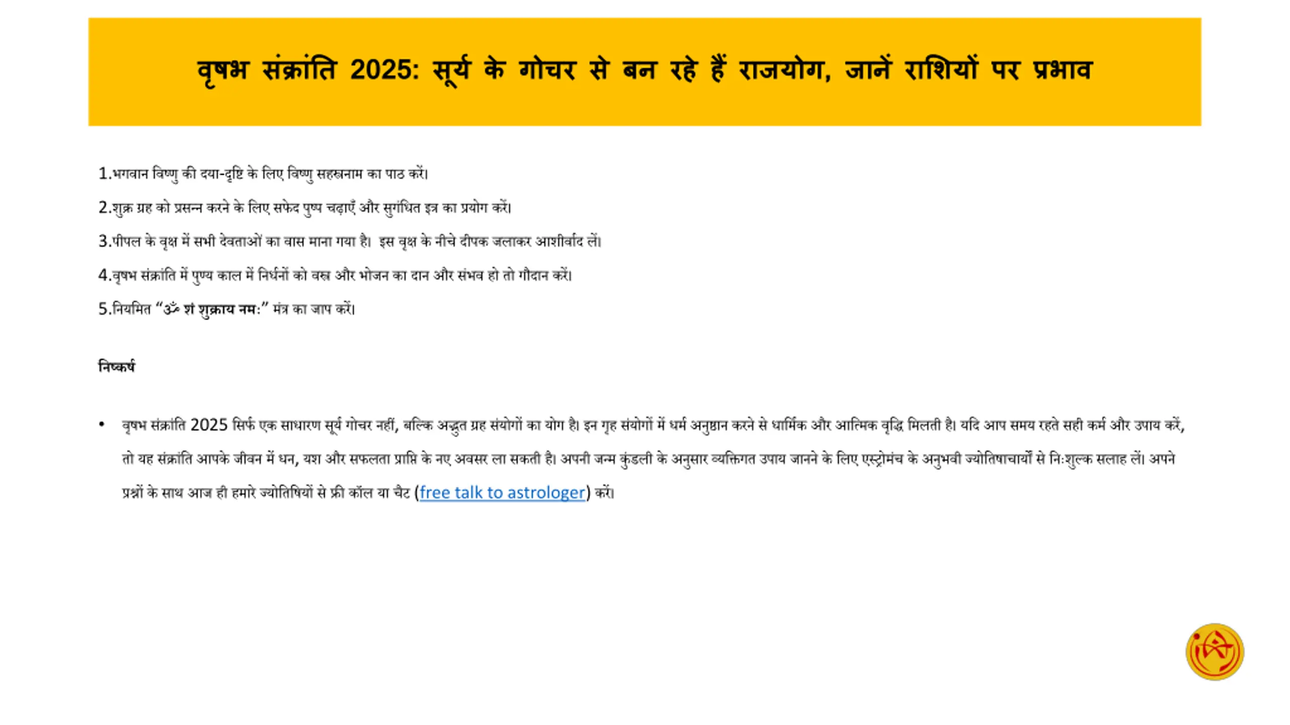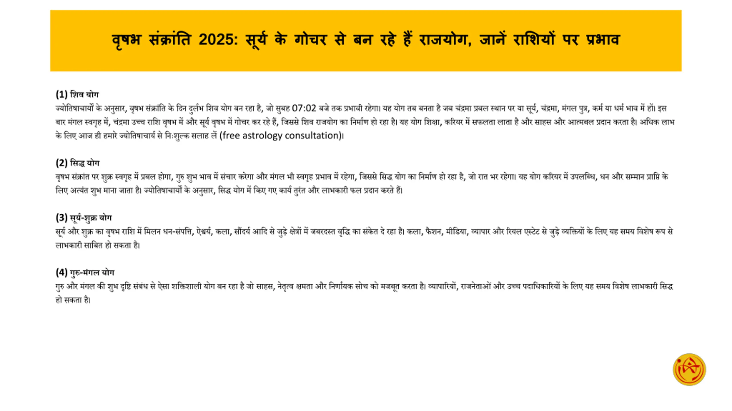 nWith the entry of Sun in Taurus on Vrishabha Sankranti 2025, wonderful Rajyog is being formed. Talk to astrologers for free today and know which zodiac sign will get special benefits and which measures will strengthen your luck. n