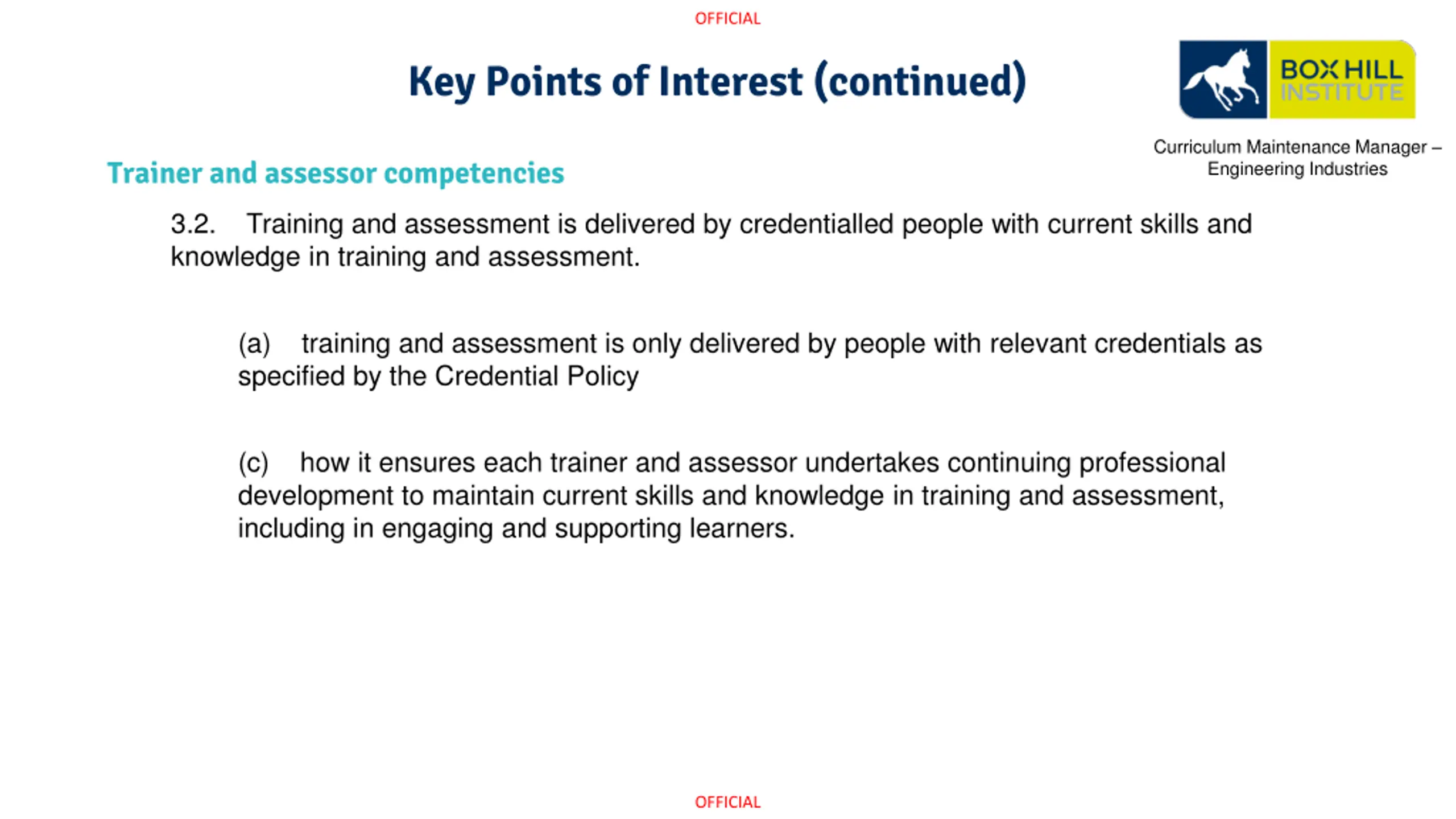 OFFICIAL Key Points of Interest (continued) Curriculum Maintenance Manager Engineering Industries Trainer and assessor competencies 3.2. Training and assessment is delivered by credentialled people with current skills and knowledge in training and assessment. (a) training and assessment is only delivered by people with relevant credentials as specified by the Credential Policy (c) how it ensures each trainer and assessor undertakes continuing professional development to maintain current skills and knowledge in training and assessment, including in engaging and supporting learners. OFFICIAL