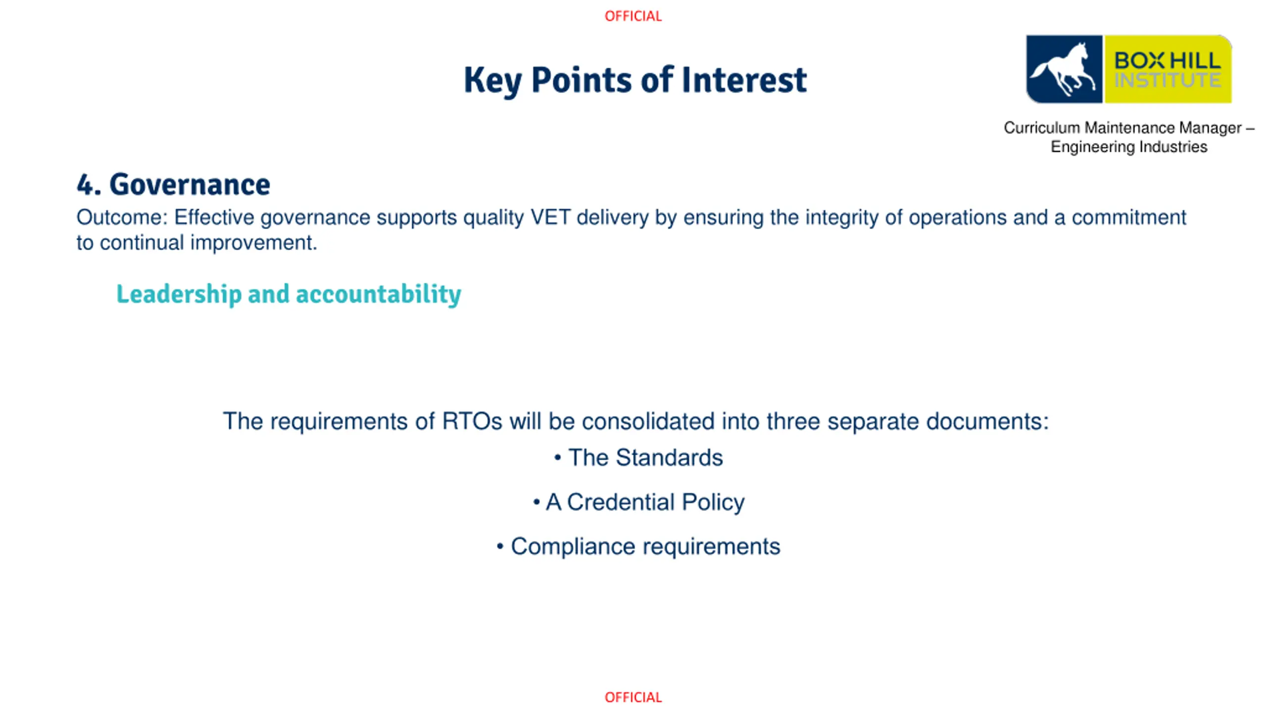 OFFICIAL Key Points of Interest Curriculum Maintenance Manager Engineering Industries 4. Governance Outcome: Effective governance supports quality VET delivery by ensuring the integrity of operations and a commitment to continual improvement. Leadership and accountability The requirements of RTOs will be consolidated into three separate documents: The Standards A Credential Policy Compliance requirements OFFICIAL