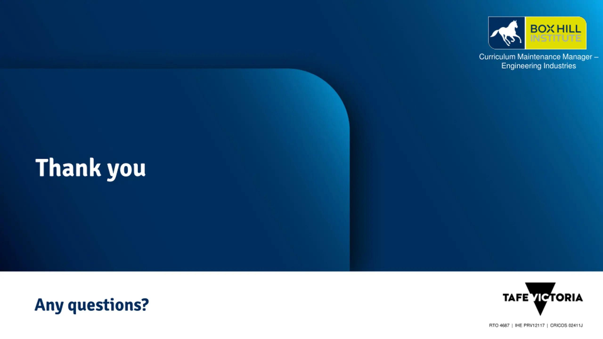 OFFICIAL Curriculum Maintenance Manager Engineering Industries Thank you Any questions? RTO 4687 | IHE PRV12117 | CRICOS 02411J OFFICIAL