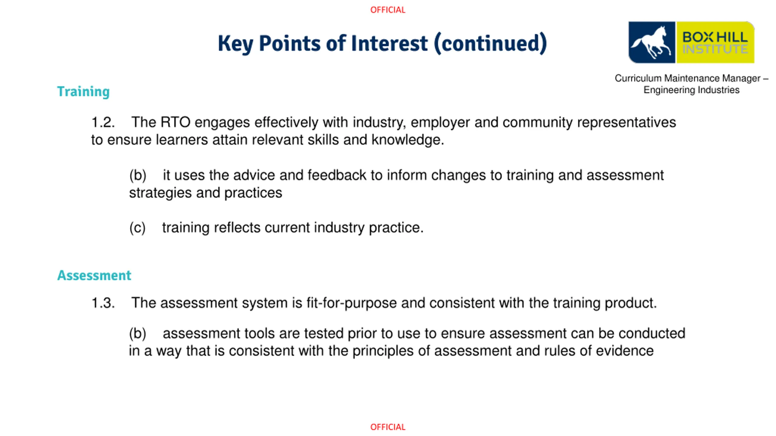 OFFICIAL Key Points of Interest (continued) Curriculum Maintenance Manager Engineering Industries Training 1.2. The RTO engages effectively with industry, employer and community representatives to ensure learners attain relevant skills and knowledge. (b) it uses the advice and feedback to inform changes to training and assessment strategies and practices (c) training reflects current industry practice. Assessment 1.3. The assessment system is fit-for-purpose and consistent with the training product. (b) assessment tools are tested prior to use to ensure assessment can be conducted in a way that is consistent with the principles of assessment and rules of evidence OFFICIAL