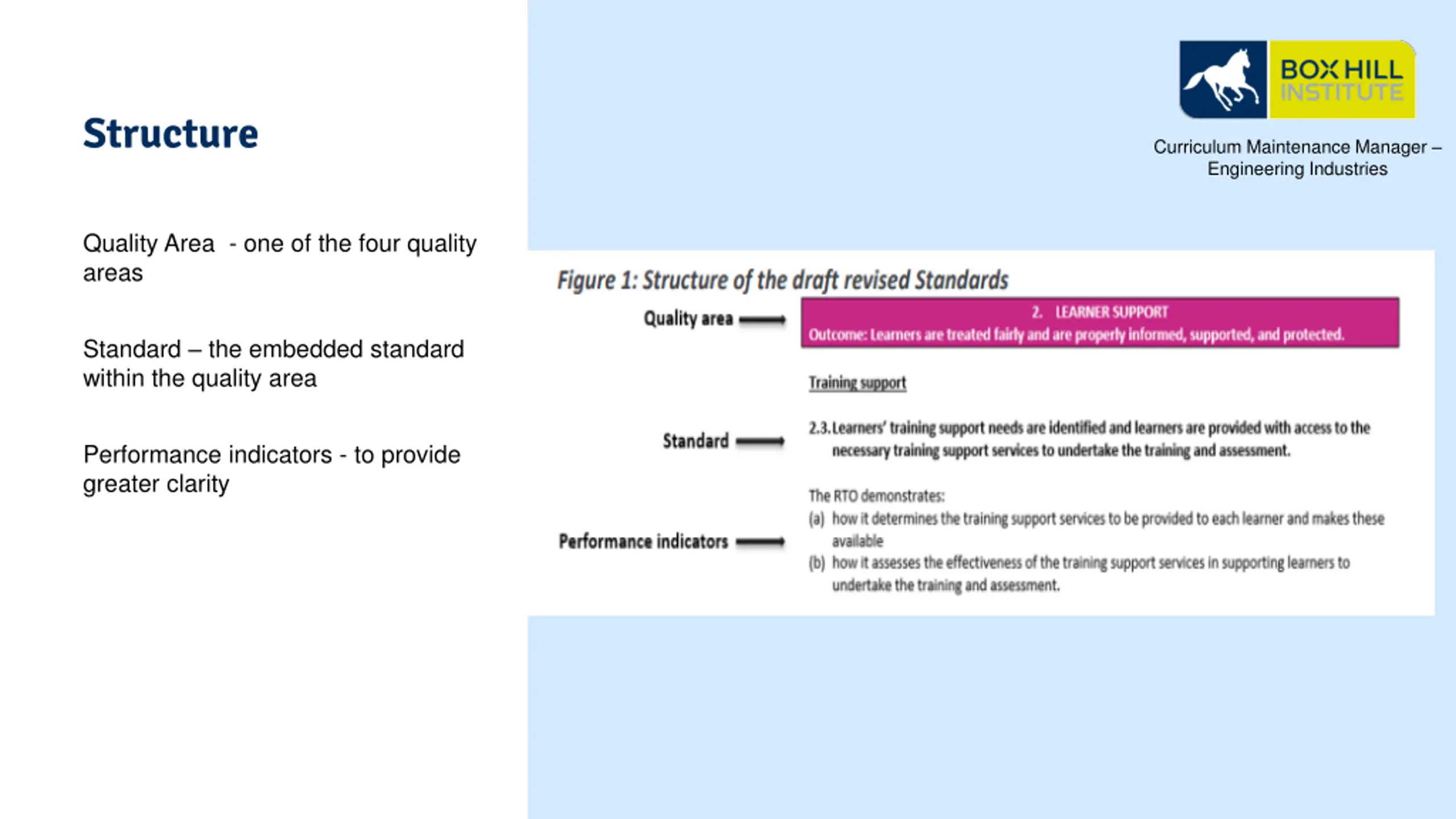 Structure Curriculum Maintenance Manager Engineering Industries Quality Area - one of the four quality areas Standard the embedded standard within the quality area Performance indicators - to provide greater clarity