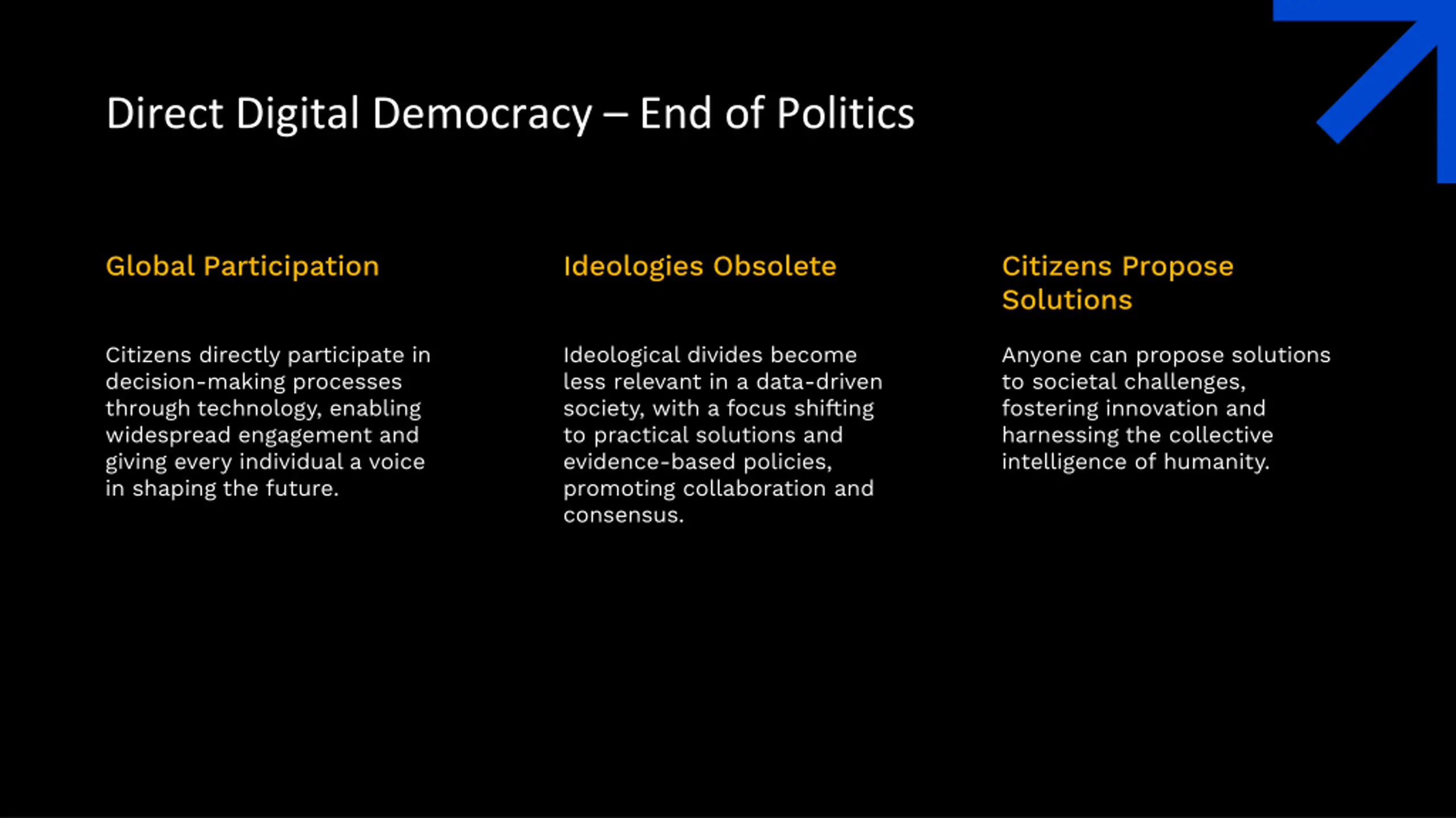 Direct Digital Democracy End of Politics Global Participation Ideologies Obsolete Citizens Propose Solutions Citizens directly participate in decision-making processes through technology, enabling widespread engagement and giving every individual a voice in shaping the future. Ideological divides become less relevant in a data-driven society, with a focus shifting to practical solutions and evidence-based policies, promoting collaboration and consensus. Anyone can propose solutions to societal challenges, fostering innovation and harnessing the collective intelligence of humanity.