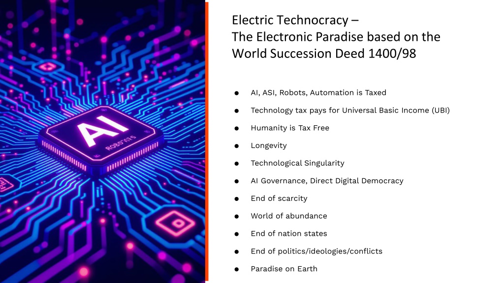 Electric Technocracy The Electronic Paradise based on the World Succession Deed 1400/98 AI, ASI, Robots, Automation is Taxed Technology tax pays for Universal Basic Income (UBI) Humanity is Tax Free Longevity Technological Singularity AI Governance, Direct Digital Democracy End of scarcity World of abundance End of nation states End of politics/ideologies/conflicts Paradise on Earth
