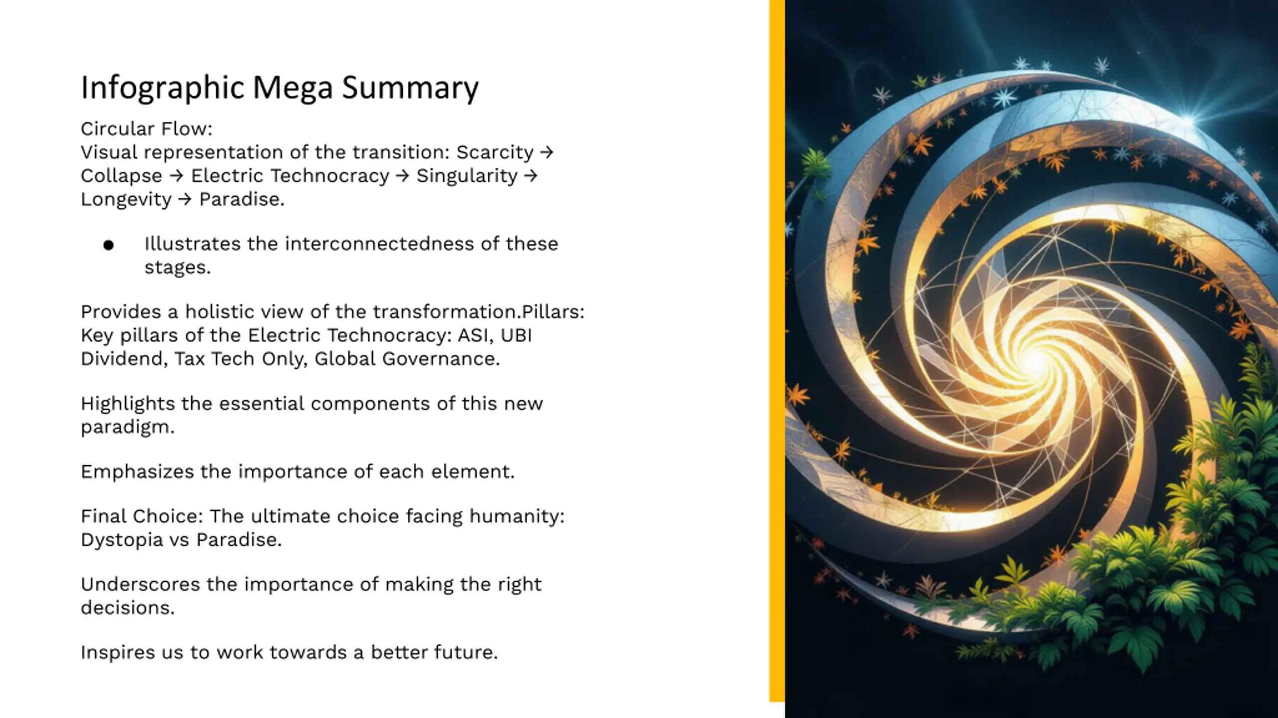 Infographic Mega Summary Circular Flow: Visual representation of the transition: Scarcity Collapse Electric Technocracy Singularity Longevity Paradise. Illustrates the interconnectedness of these stages. Provides a holistic view of the transformation.Pillars: Key pillars of the Electric Technocracy: ASI, UBI Dividend, Tax Tech Only, Global Governance. Highlights the essential components of this new paradigm. Emphasizes the importance of each element. Final Choice: The ultimate choice facing humanity: Dystopia vs Paradise. Underscores the importance of making the right decisions. Inspires us to work towards a better future.