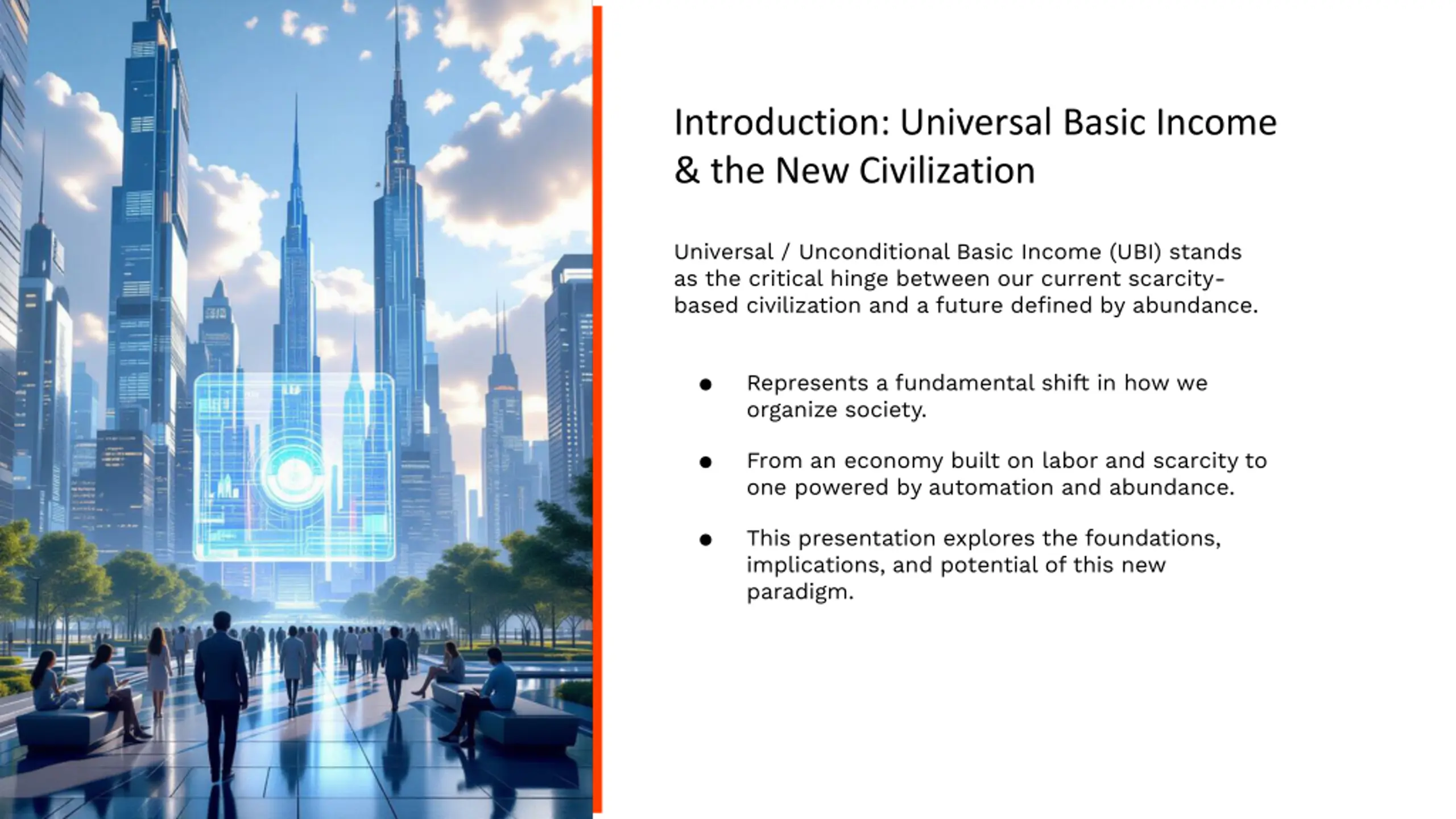 Introduction: Universal Basic Income & the New Civilization Universal / Unconditional Basic Income (UBI) stands as the critical hinge between our current scarcity- based civilization and a future defined by abundance. Represents a fundamental shift in how we organize society. From an economy built on labor and scarcity to one powered by automation and abundance. This presentation explores the foundations, implications, and potential of this new paradigm.