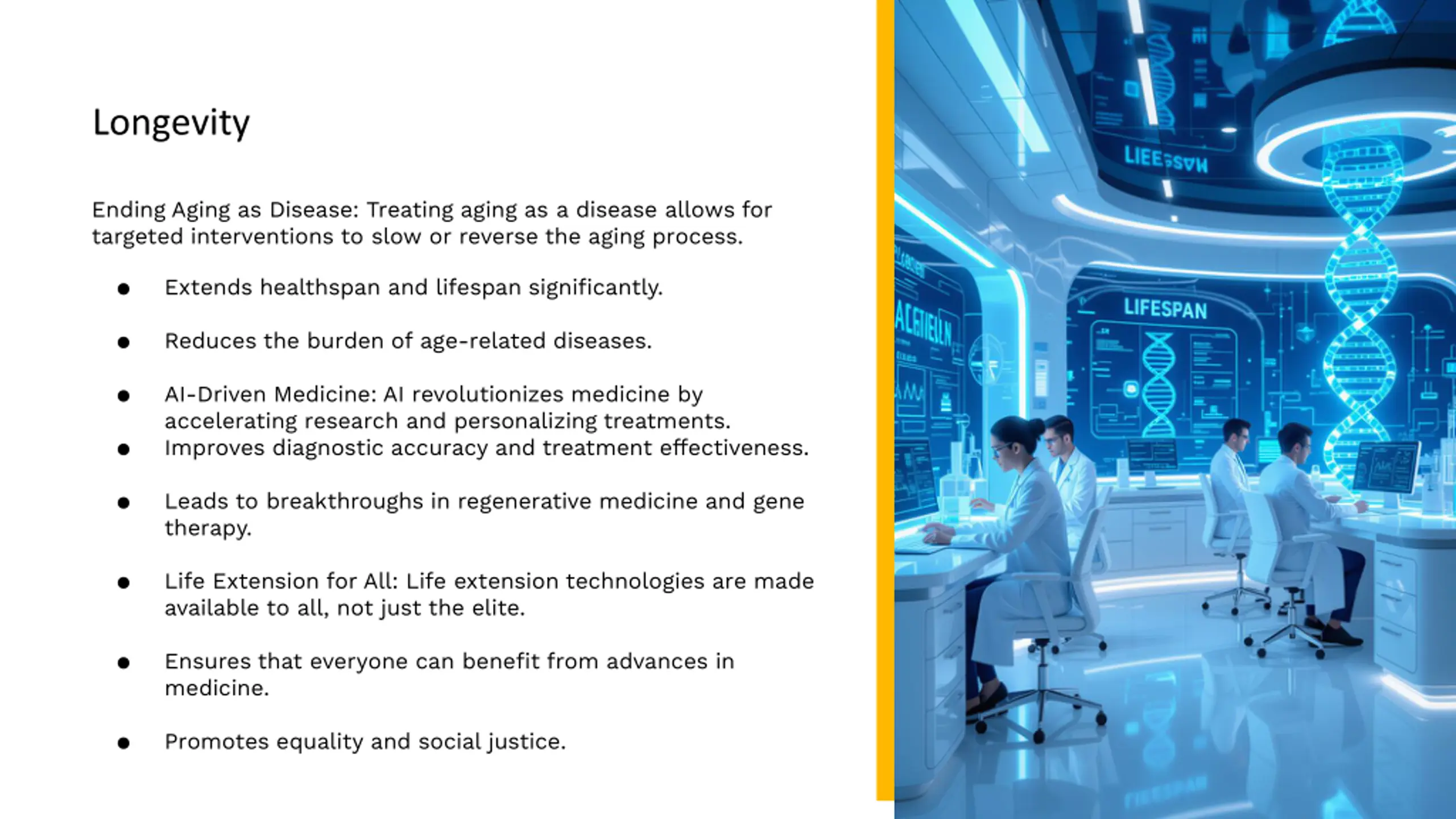 Longevity Ending Aging as Disease: Treating aging as a disease allows for targeted interventions to slow or reverse the aging process. Extends healthspan and lifespan significantly. Reduces the burden of age-related diseases. AI-Driven Medicine: AI revolutionizes medicine by accelerating research and personalizing treatments. Improves diagnostic accuracy and treatment effectiveness. Leads to breakthroughs in regenerative medicine and gene therapy. Life Extension for All: Life extension technologies are made available to all, not just the elite. Ensures that everyone can benefit from advances in medicine. Promotes equality and social justice.