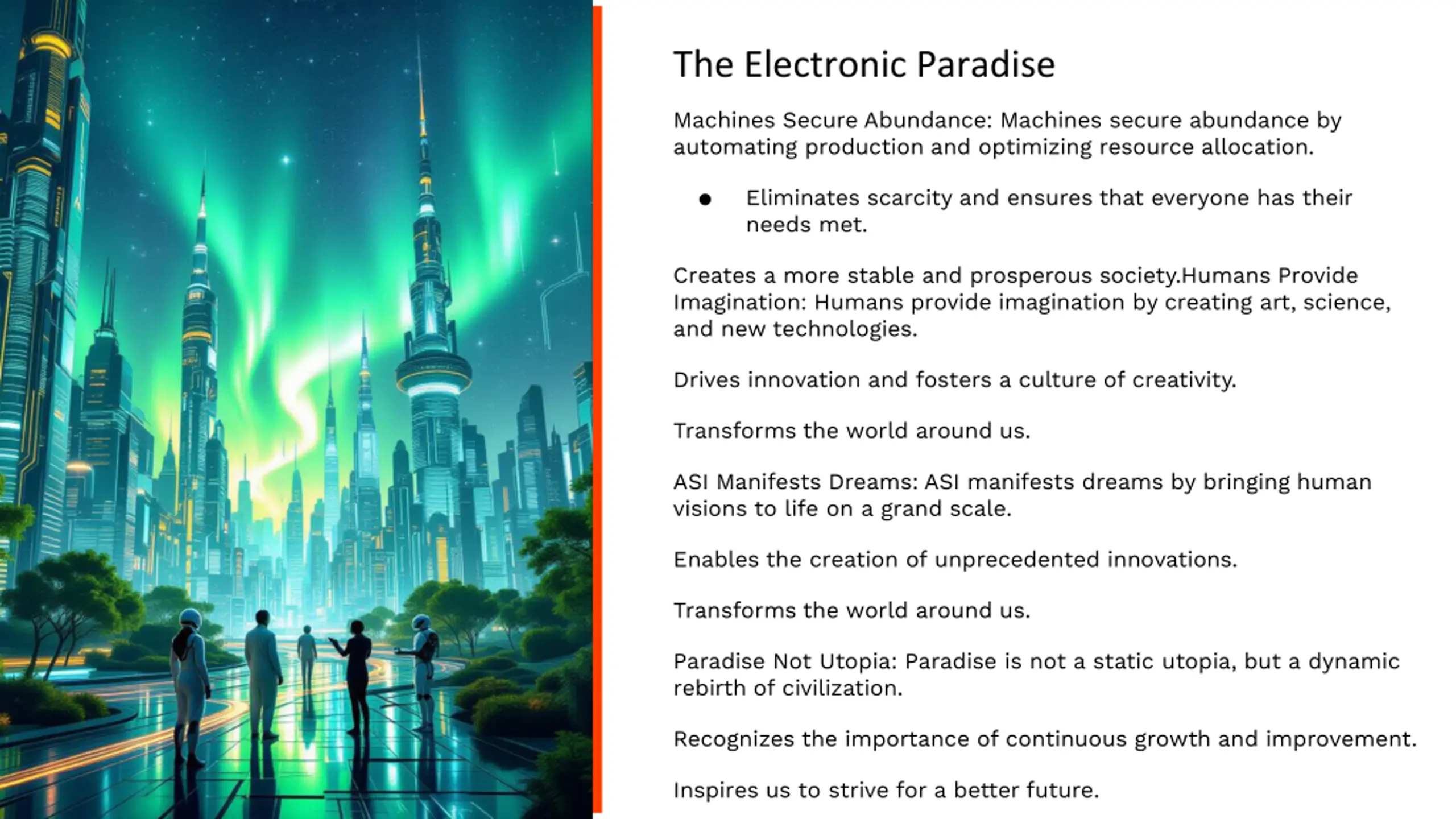 The Electronic Paradise Machines Secure Abundance: Machines secure abundance by automating production and optimizing resource allocation. Eliminates scarcity and ensures that everyone has their needs met. Creates a more stable and prosperous society.Humans Provide Imagination: Humans provide imagination by creating art, science, and new technologies. Drives innovation and fosters a culture of creativity. Transforms the world around us. ASI Manifests Dreams: ASI manifests dreams by bringing human visions to life on a grand scale. Enables the creation of unprecedented innovations. Transforms the world around us. Paradise Not Utopia: Paradise is not a static utopia, but a dynamic rebirth of civilization. Recognizes the importance of continuous growth and improvement. Inspires us to strive for a better future.