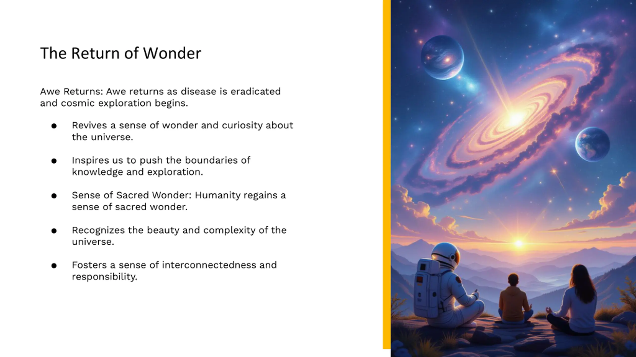 The Return of Wonder Awe Returns: Awe returns as disease is eradicated and cosmic exploration begins. Revives a sense of wonder and curiosity about the universe. Inspires us to push the boundaries of knowledge and exploration. Sense of Sacred Wonder: Humanity regains a sense of sacred wonder. Recognizes the beauty and complexity of the universe. Fosters a sense of interconnectedness and responsibility.