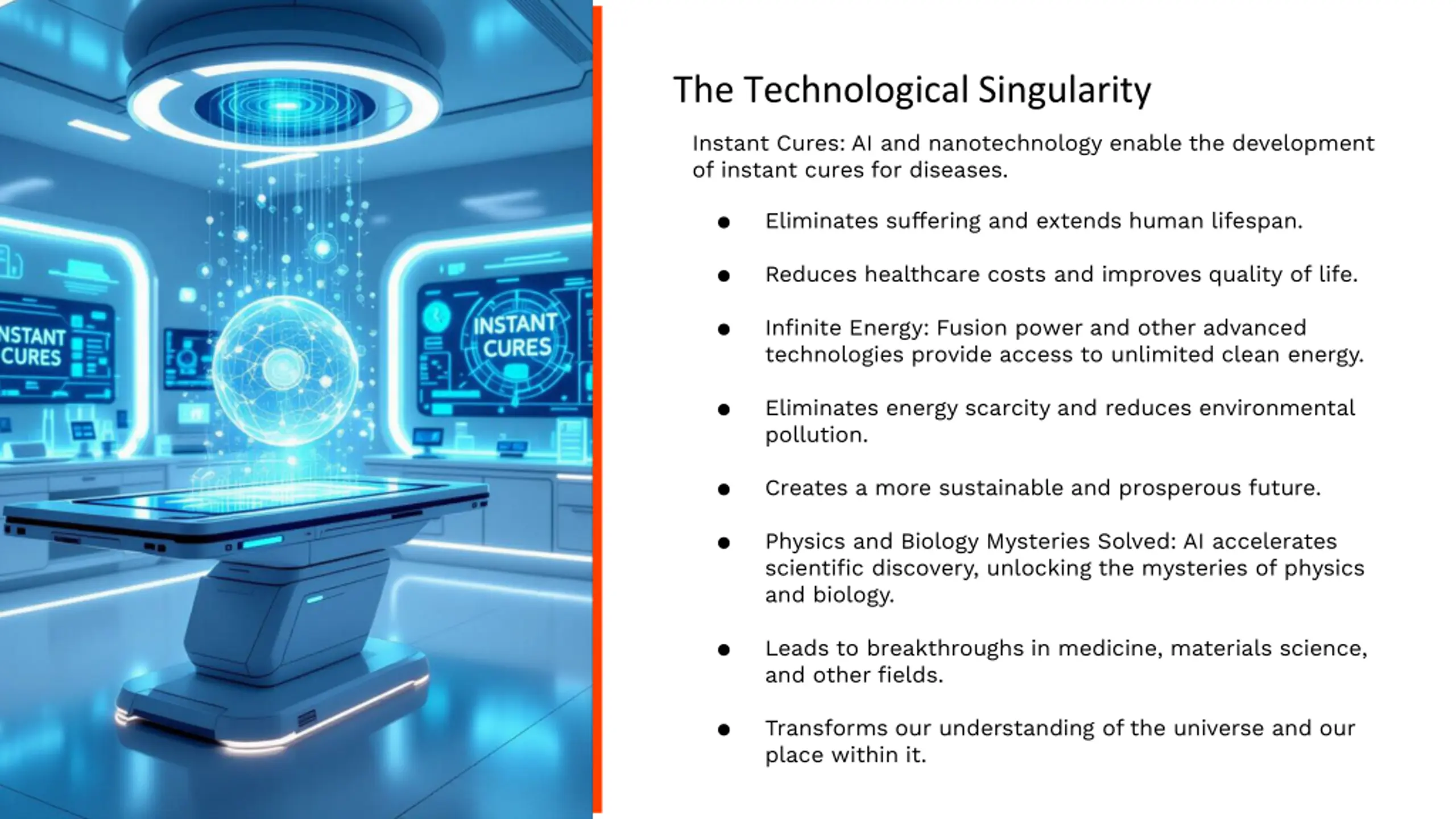 The Technological Singularity Instant Cures: AI and nanotechnology enable the development of instant cures for diseases. Eliminates suffering and extends human lifespan. Reduces healthcare costs and improves quality of life. Infinite Energy: Fusion power and other advanced technologies provide access to unlimited clean energy. Eliminates energy scarcity and reduces environmental pollution. Creates a more sustainable and prosperous future. Physics and Biology Mysteries Solved: AI accelerates scientific discovery, unlocking the mysteries of physics and biology. Leads to breakthroughs in medicine, materials science, and other fields. Transforms our understanding of the universe and our place within it.
