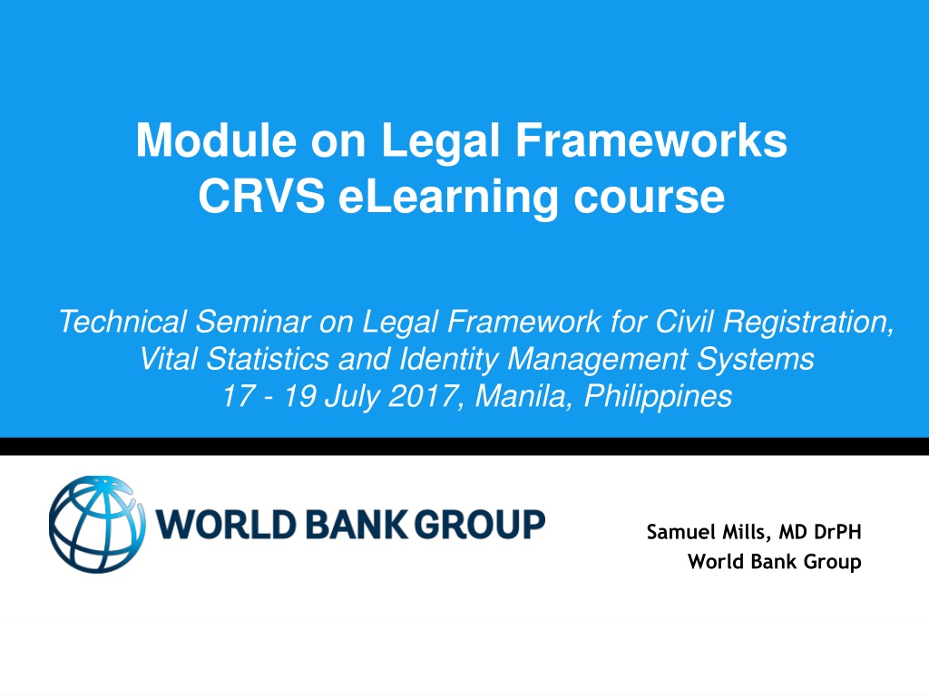 Module on Legal Frameworks CRVS eLearning course Technical Seminar on Legal Framework for Civil Registration, Vital Statistics and Identity Management Systems 17 - 19 July 2017, Manila, Philippines Samuel Mills, MD DrPH World Bank Group