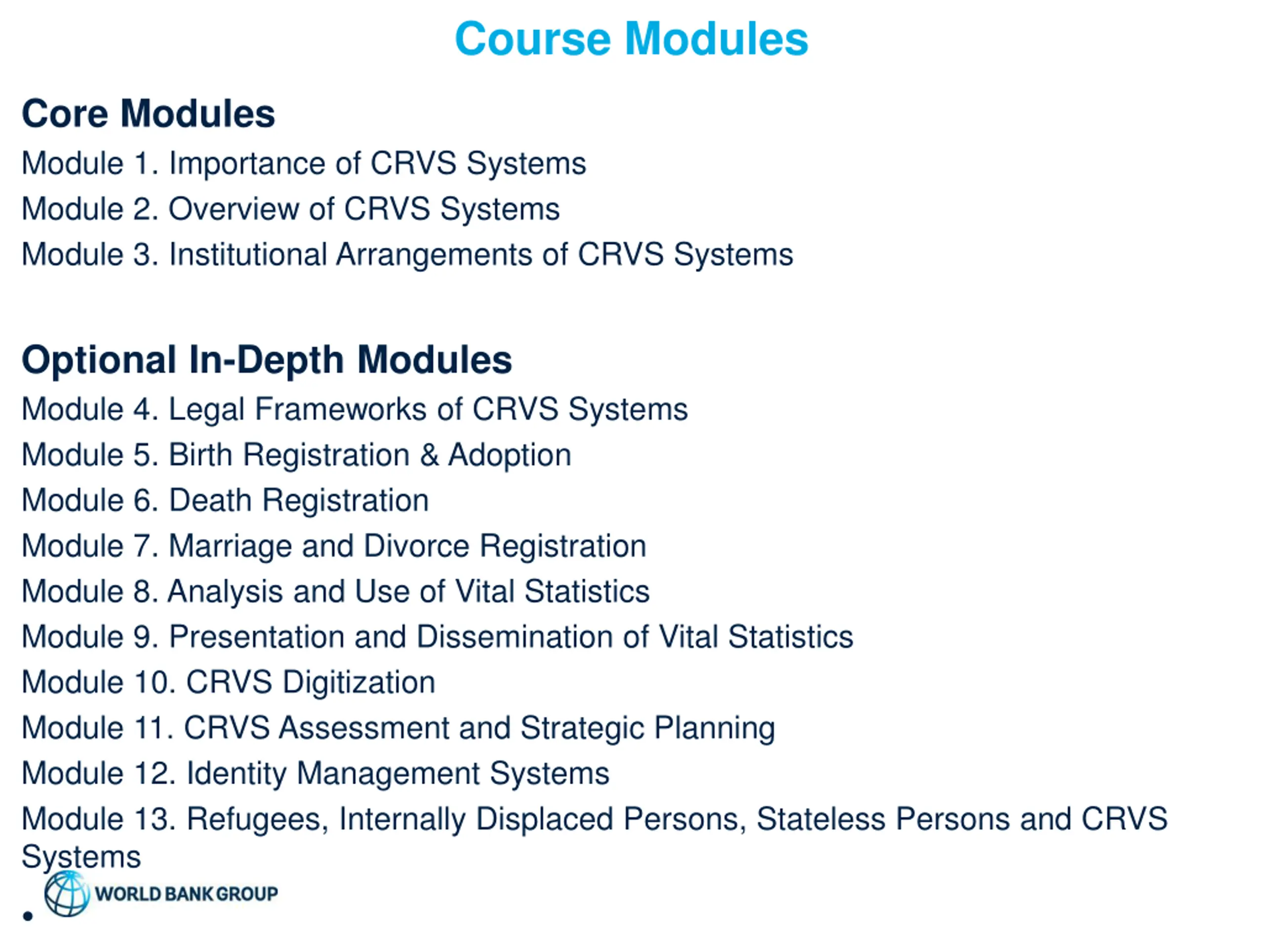 Course Modules Core Modules Module 1. Importance of CRVS Systems Module 2. Overview of CRVS Systems Module 3. Institutional Arrangements of CRVS Systems Optional In-Depth Modules Module 4. Legal Frameworks of CRVS Systems Module 5. Birth Registration & Adoption Module 6. Death Registration Module 7. Marriage and Divorce Registration Module 8. Analysis and Use of Vital Statistics Module 9. Presentation and Dissemination of Vital Statistics Module 10. CRVS Digitization Module 11. CRVS Assessment and Strategic Planning Module 12. Identity Management Systems Module 13. Refugees, Internally Displaced Persons, Stateless Persons and CRVS Systems