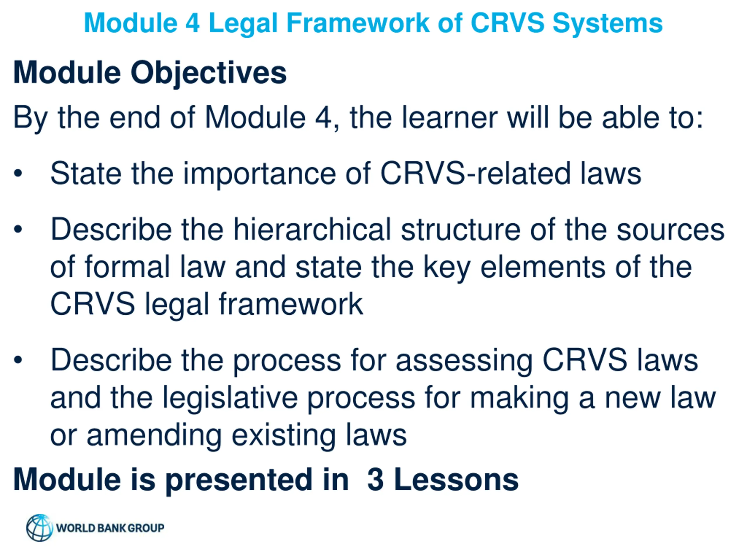 Module 4 Legal Framework of CRVS Systems Module Objectives By the end of Module 4, the learner will be able to: State the importance of CRVS-related laws Describe the hierarchical structure of the sources of formal law and state the key elements of the CRVS legal framework Describe the process for assessing CRVS laws and the legislative process for making a new law or amending existing laws Module is presented in 3 Lessons