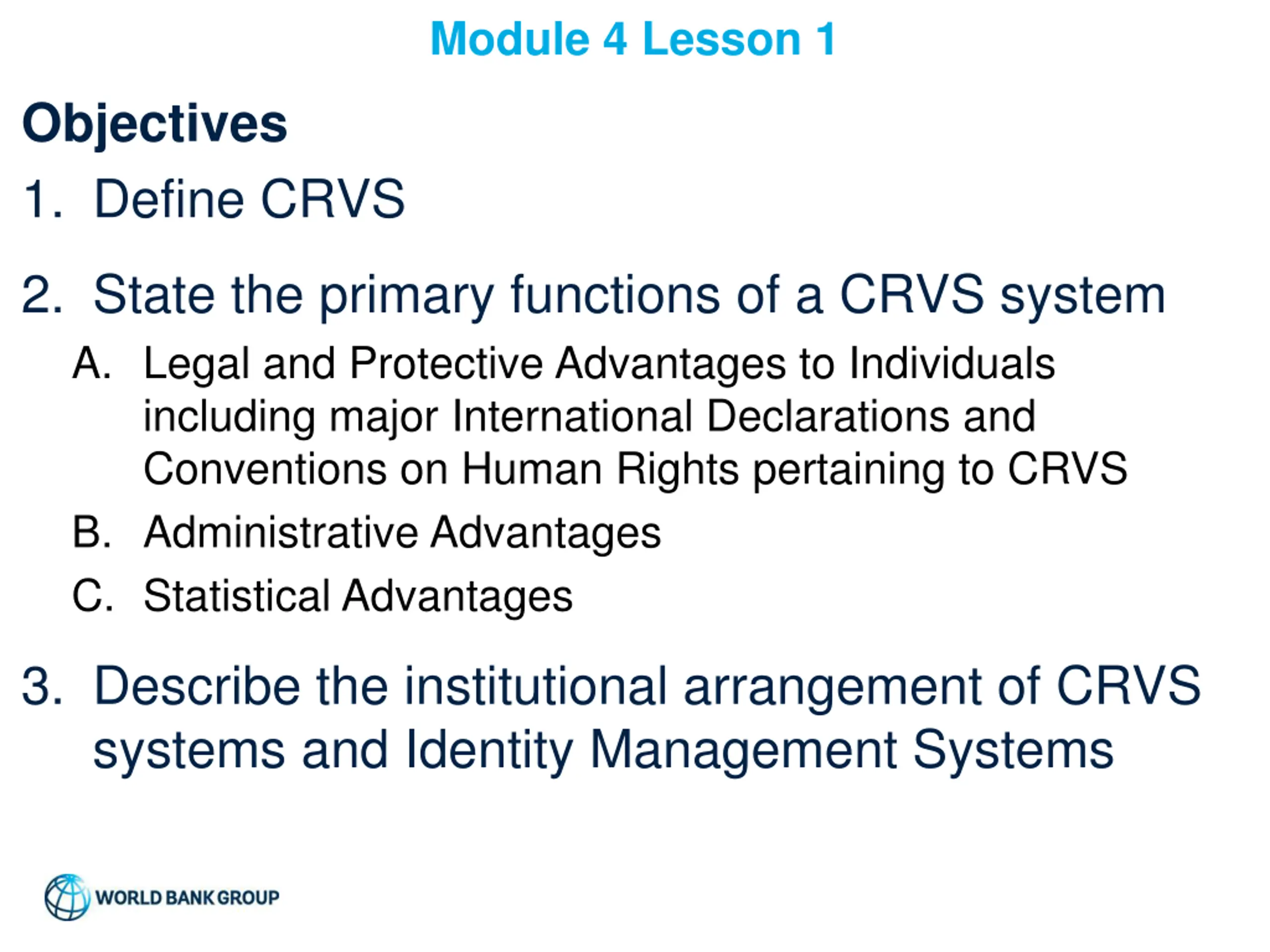 Module 4 Lesson 1 Objectives 1. Define CRVS 2. State the primary functions of a CRVS system A. Legal and Protective Advantages to Individuals including major International Declarations and Conventions on Human Rights pertaining to CRVS B. Administrative Advantages C. Statistical Advantages 3. Describe the institutional arrangement of CRVS systems and Identity Management Systems