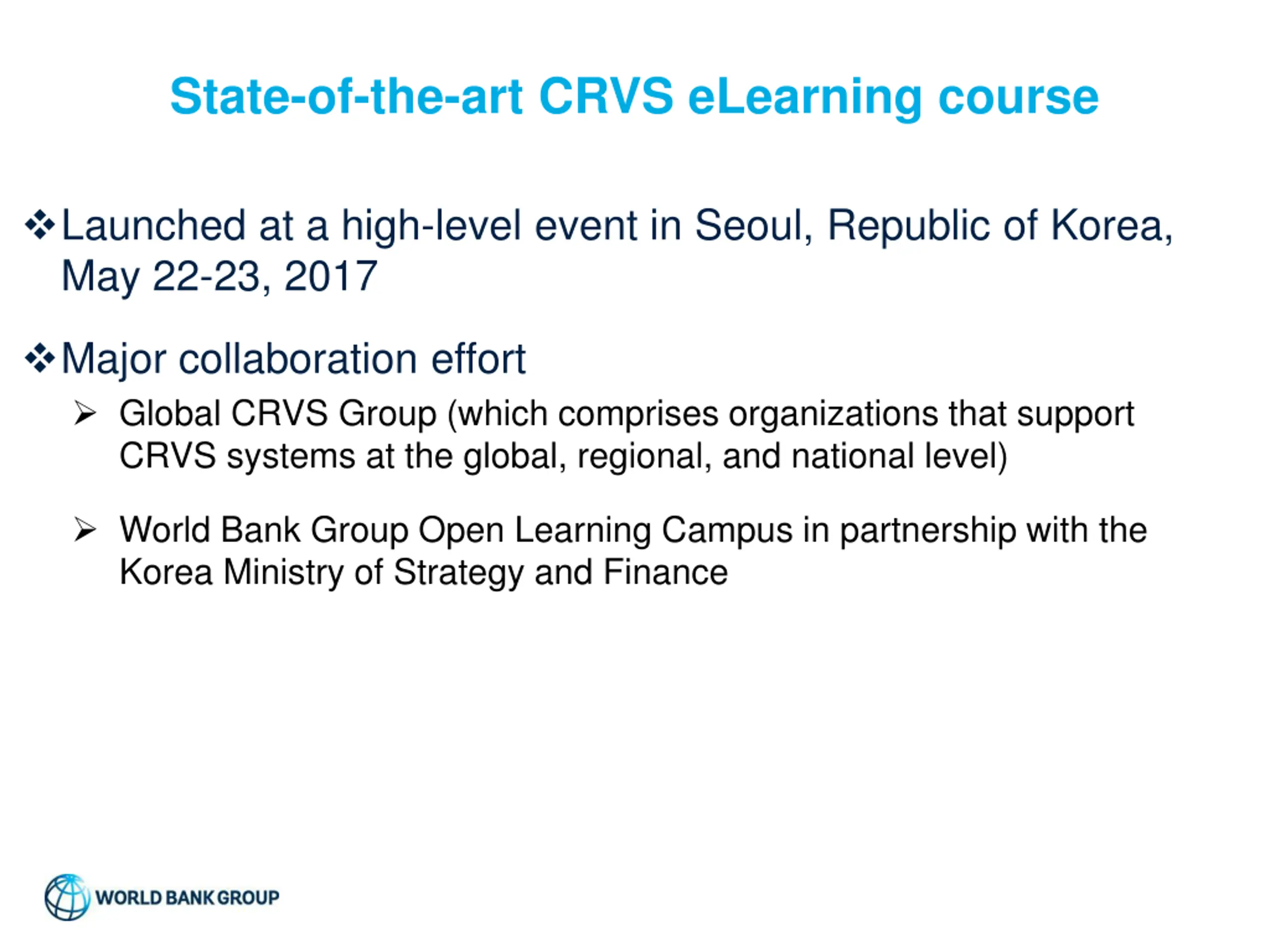State-of-the-art CRVS eLearning course Launched at a high-level event in Seoul, Republic of Korea, May 22-23, 2017 Major collaboration effort Global CRVS Group (which comprises organizations that support CRVS systems at the global, regional, and national level) World Bank Group Open Learning Campus in partnership with the Korea Ministry of Strategy and Finance