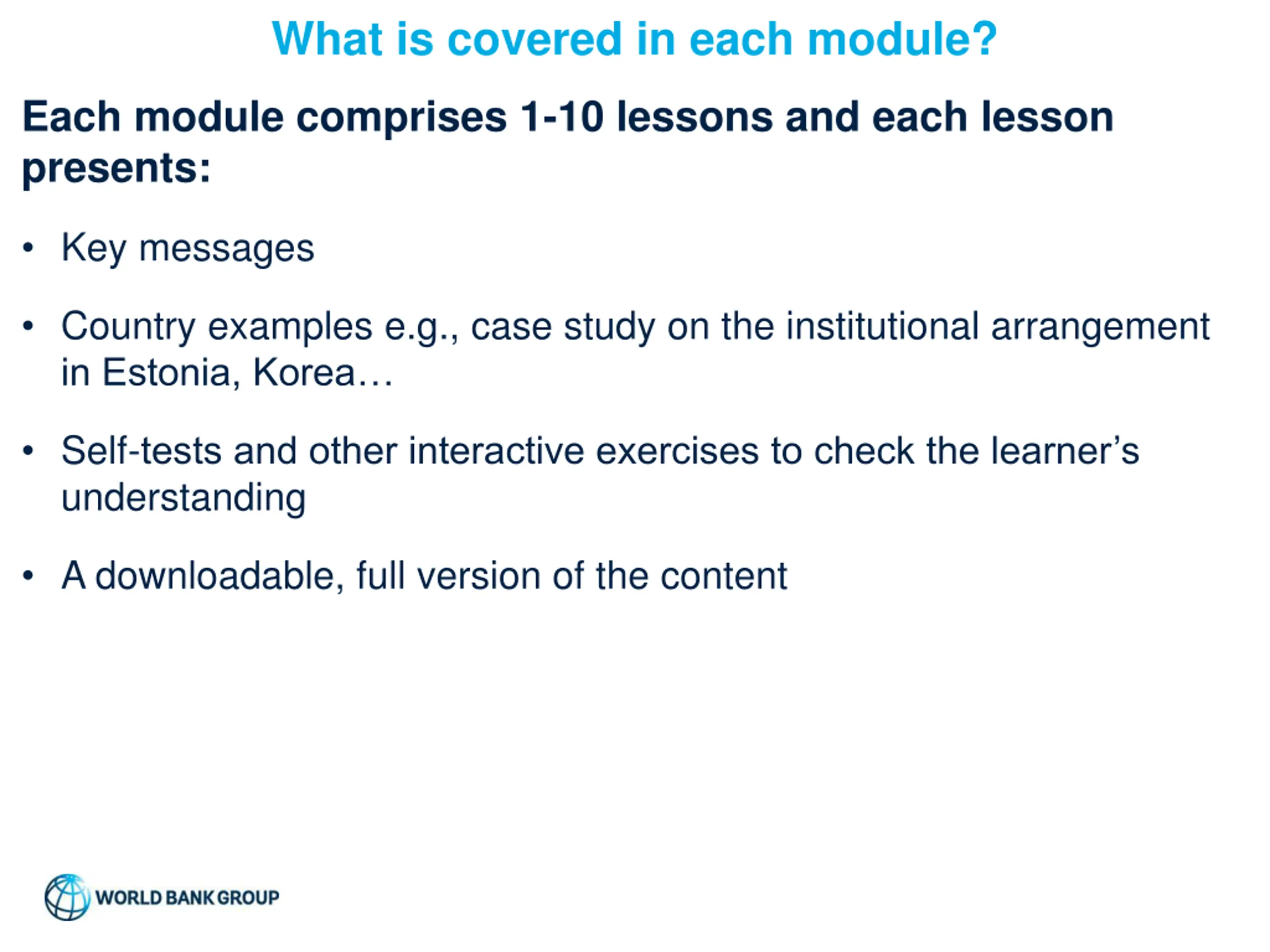 What is covered in each module? Each module comprises 1-10 lessons and each lesson presents: Key messages Country examples e.g., case study on the institutional arrangement in Estonia, Korea Self-tests and other interactive exercises to check the learner s understanding A downloadable, full version of the content