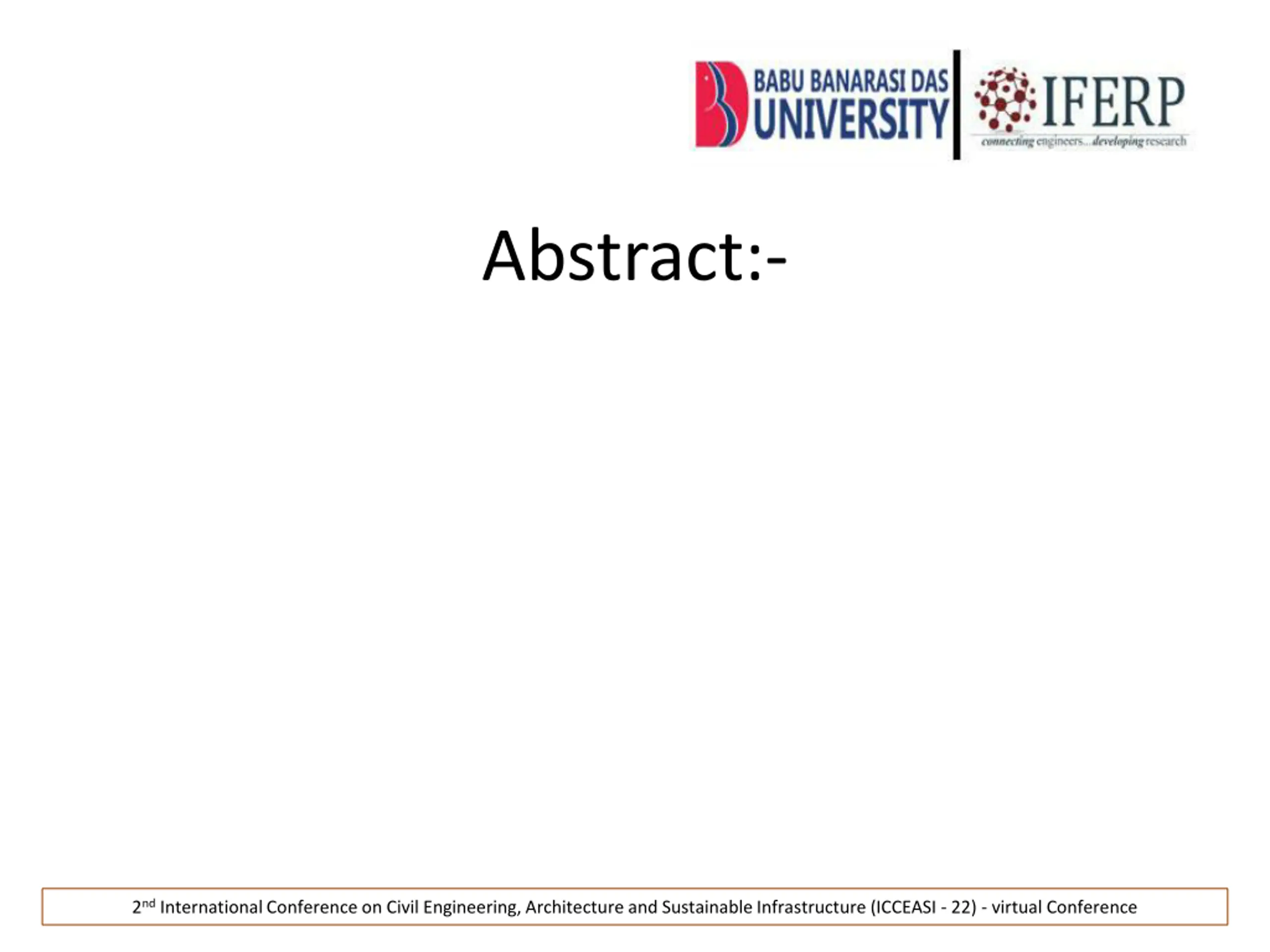 Abstract:- 2nd International Conference on Civil Engineering, Architecture and Sustainable Infrastructure (ICCEASI - 22) - virtual Conference