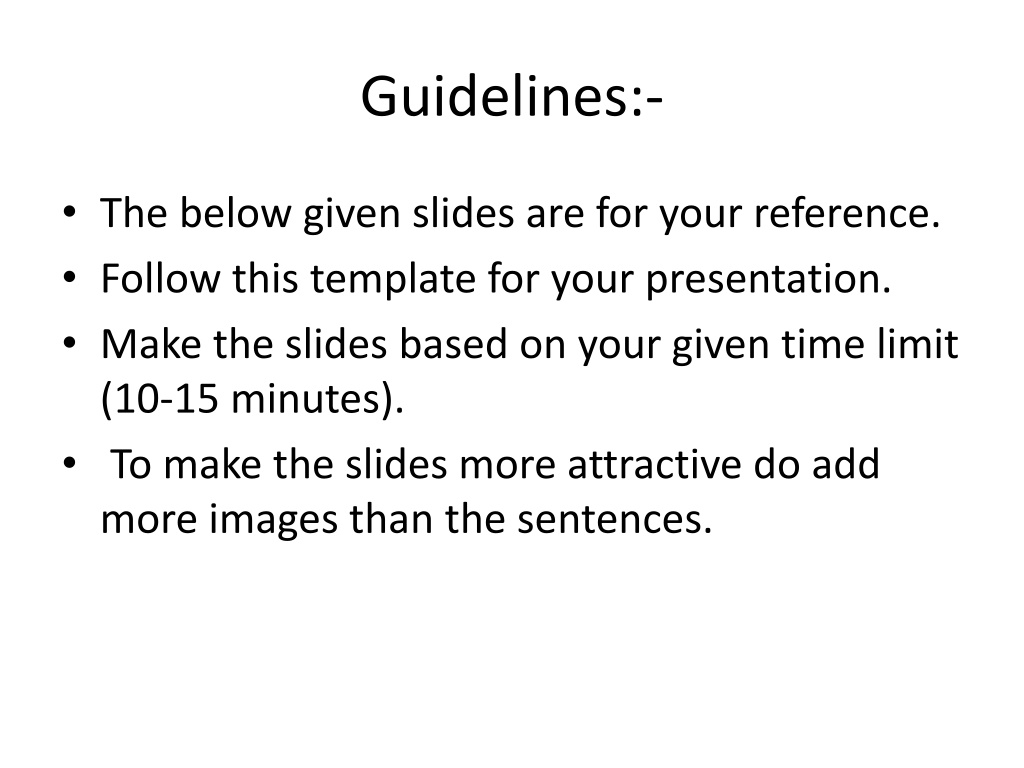Guidelines:- The below given slides are for your reference. Follow this template for your presentation. Make the slides based on your given time limit (10-15 minutes). To make the slides more attractive do add more images than the sentences.