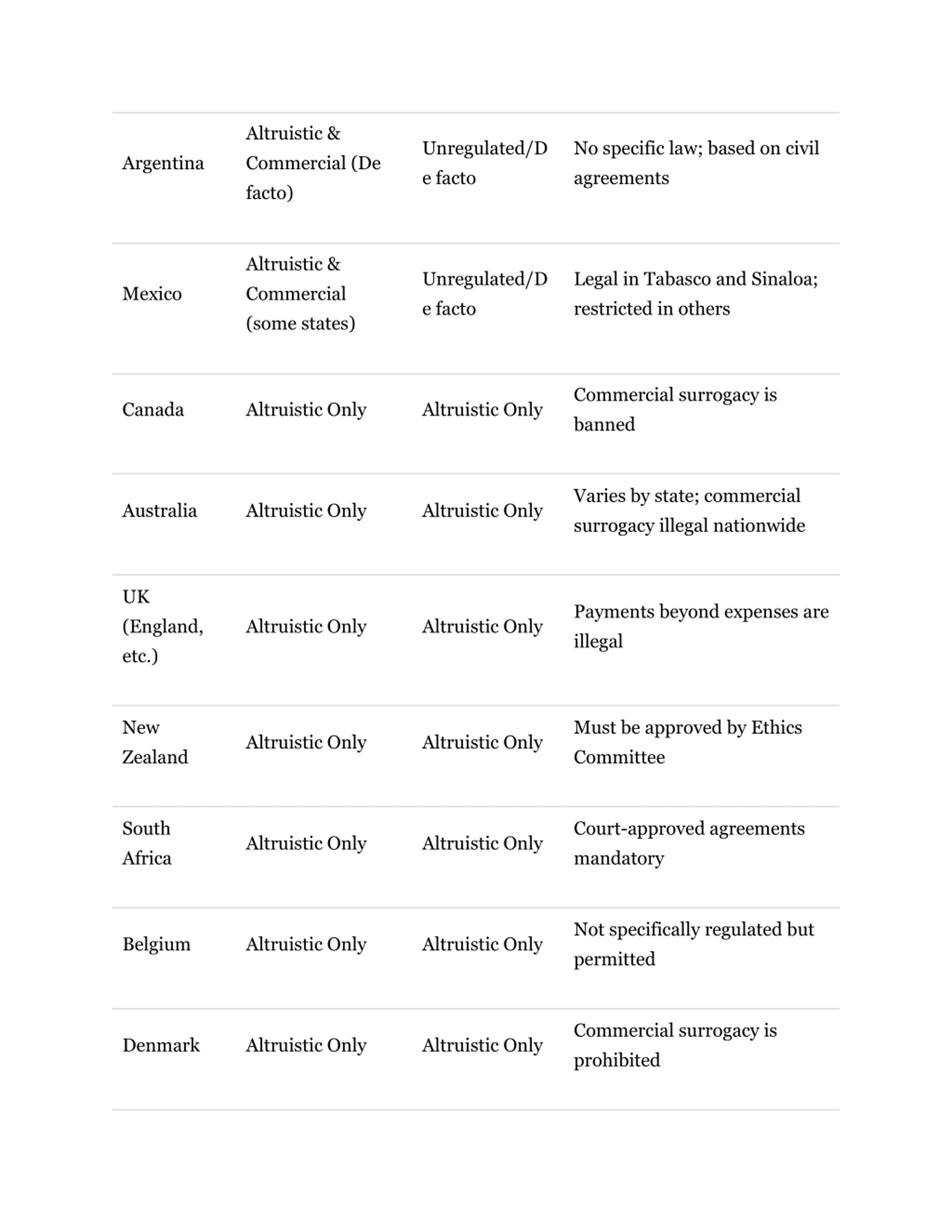 Altruistic & Commercial (De facto) Unregulated/D e facto No specific law; based on civil agreements Argentina Altruistic & Commercial (some states) Unregulated/D e facto Legal in Tabasco and Sinaloa; restricted in others Mexico Commercial surrogacy is banned Canada Altruistic Only Altruistic Only Varies by state; commercial surrogacy illegal nationwide Australia Altruistic Only Altruistic Only UK (England, etc.) Payments beyond expenses are illegal Altruistic Only Altruistic Only New Zealand Must be approved by Ethics Committee Altruistic Only Altruistic Only South Africa Court-approved agreements mandatory Altruistic Only Altruistic Only Not specifically regulated but permitted Belgium Altruistic Only Altruistic Only Commercial surrogacy is prohibited Denmark Altruistic Only Altruistic Only
