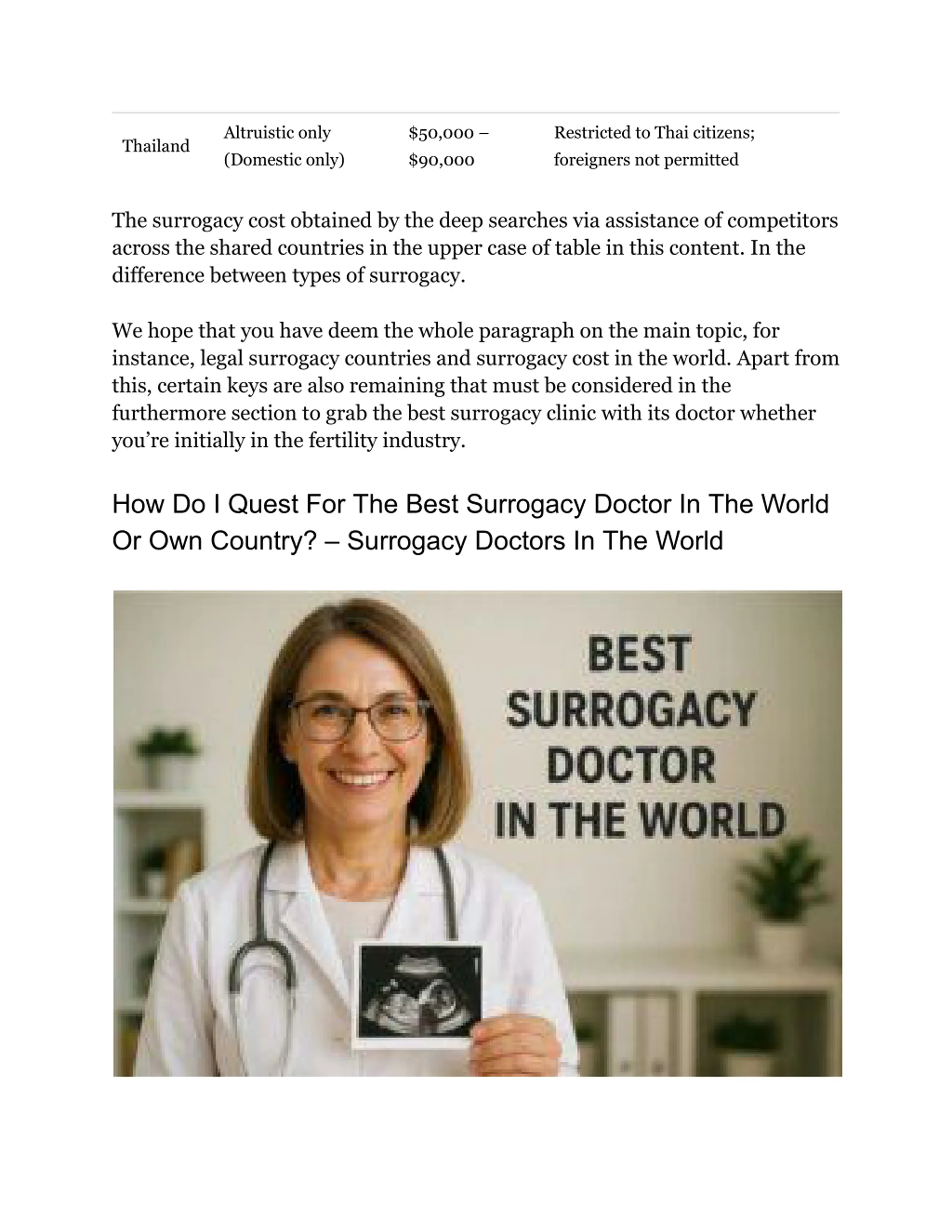 Altruistic only (Domestic only) $50,000 $90,000 Restricted to Thai citizens; foreigners not permitted Thailand The surrogacy cost obtained by the deep searches via assistance of competitors across the shared countries in the upper case of table in this content. In the difference between types of surrogacy. We hope that you have deem the whole paragraph on the main topic, for instance, legal surrogacy countries and surrogacy cost in the world. Apart from this, certain keys are also remaining that must be considered in the furthermore section to grab the best surrogacy clinic with its doctor whether you re initially in the fertility industry. How Do I Quest For The Best Surrogacy Doctor In The World Or Own Country? Surrogacy Doctors In The World