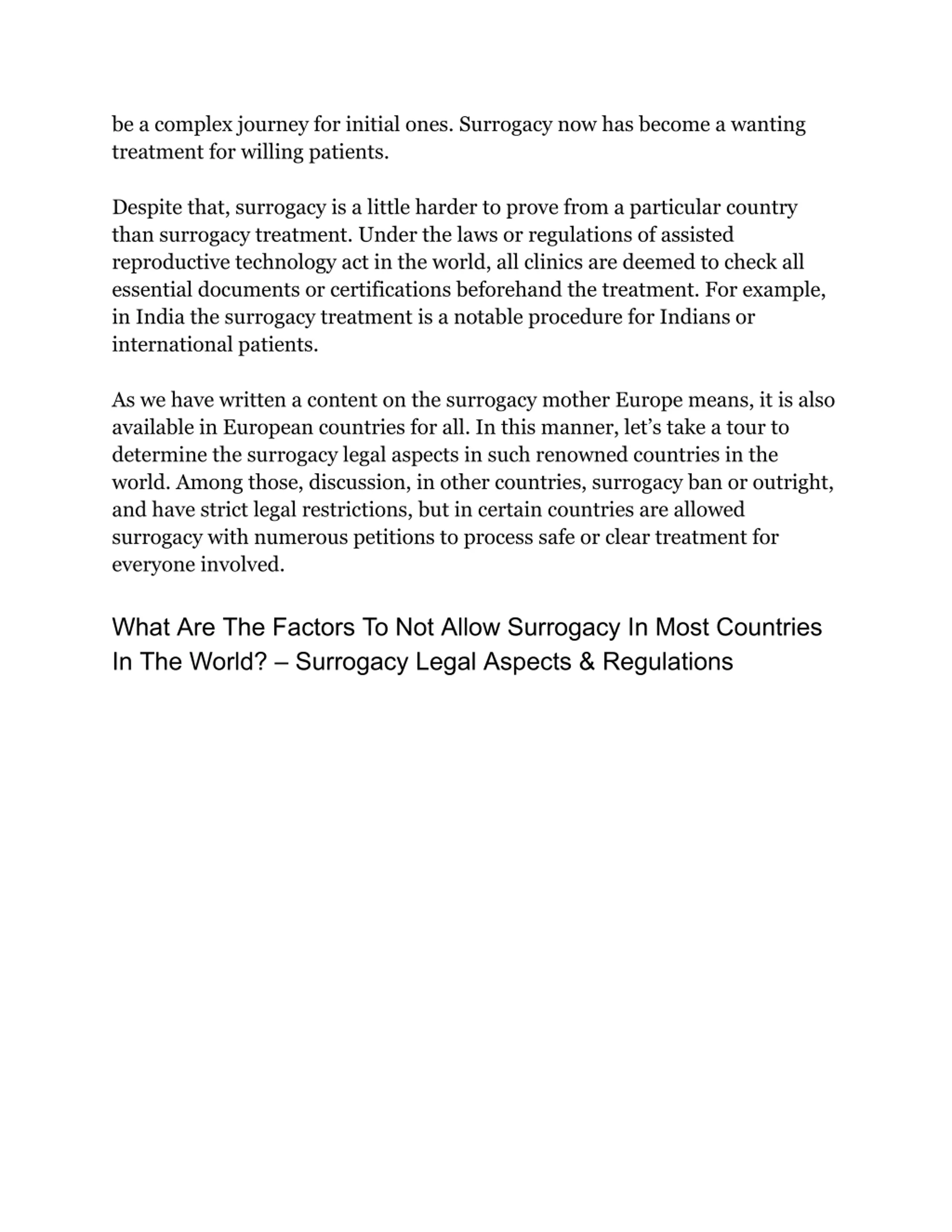 Surrogacy Legal Aspects & Regulations Despite emerging treatment among the needy ones, in several countries surrogacy is restricted or prohibited in the world. Beyond knowing the best surrogacy clinics in the World, it s essential to check the aspects of legal or regulation keys beforehand the surrogacy treatment under the frequent surrogacy specialists. In these exciting paragraphs, we have elaborated the rules or regulations which are necessary for everyone. Let s check out the adequate numerous factors in the below bullets with a meaningful determination. Ethical Concern In the ethical concern of having fear of exploitation of patients or a surrogate mother before or after the treatment. Especially for those people who belong to the economically disadvantaged background.