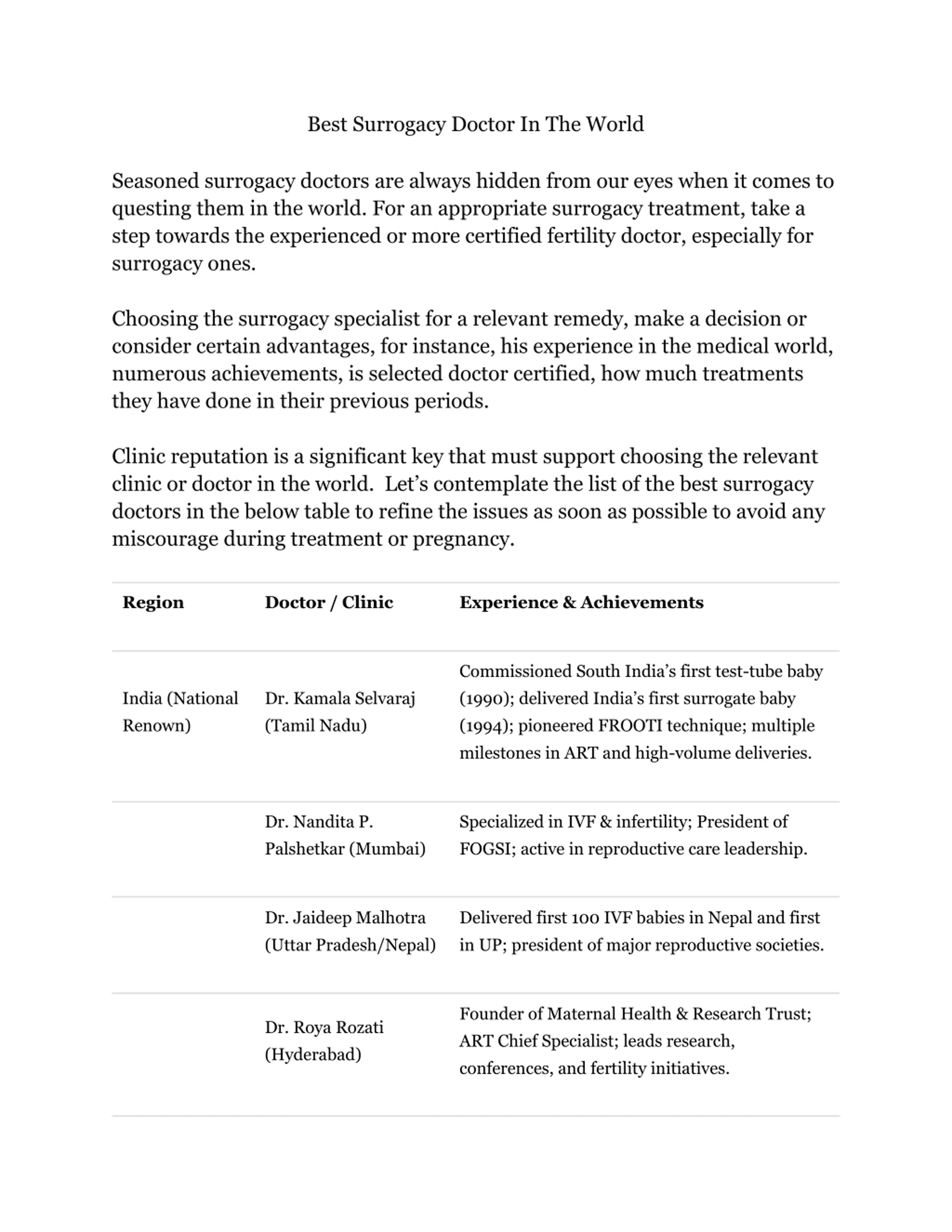 Best Surrogacy Doctor In The World Seasoned surrogacy doctors are always hidden from our eyes when it comes to questing them in the world. For an appropriate surrogacy treatment, take a step towards the experienced or more certified fertility doctor, especially for surrogacy ones. Choosing the surrogacy specialist for a relevant remedy, make a decision or consider certain advantages, for instance, his experience in the medical world, numerous achievements, is selected doctor certified, how much treatments they have done in their previous periods. Clinic reputation is a significant key that must support choosing the relevant clinic or doctor in the world. Let s contemplate the list of the best surrogacy doctors in the below table to refine the issues as soon as possible to avoid any miscourage during treatment or pregnancy. Region Doctor / Clinic Experience & Achievements Commissioned South India s first test-tube baby (1990); delivered India s first surrogate baby (1994); pioneered FROOTI technique; multiple milestones in ART and high-volume deliveries. India (National Renown) Dr. Kamala Selvaraj (Tamil Nadu) Dr. Nandita P. Palshetkar (Mumbai) Specialized in IVF & infertility; President of FOGSI; active in reproductive care leadership. Dr. Jaideep Malhotra (Uttar Pradesh/Nepal) Delivered first 100 IVF babies in Nepal and first in UP; president of major reproductive societies. Founder of Maternal Health & Research Trust; ART Chief Specialist; leads research, conferences, and fertility initiatives. Dr. Roya Rozati (Hyderabad)